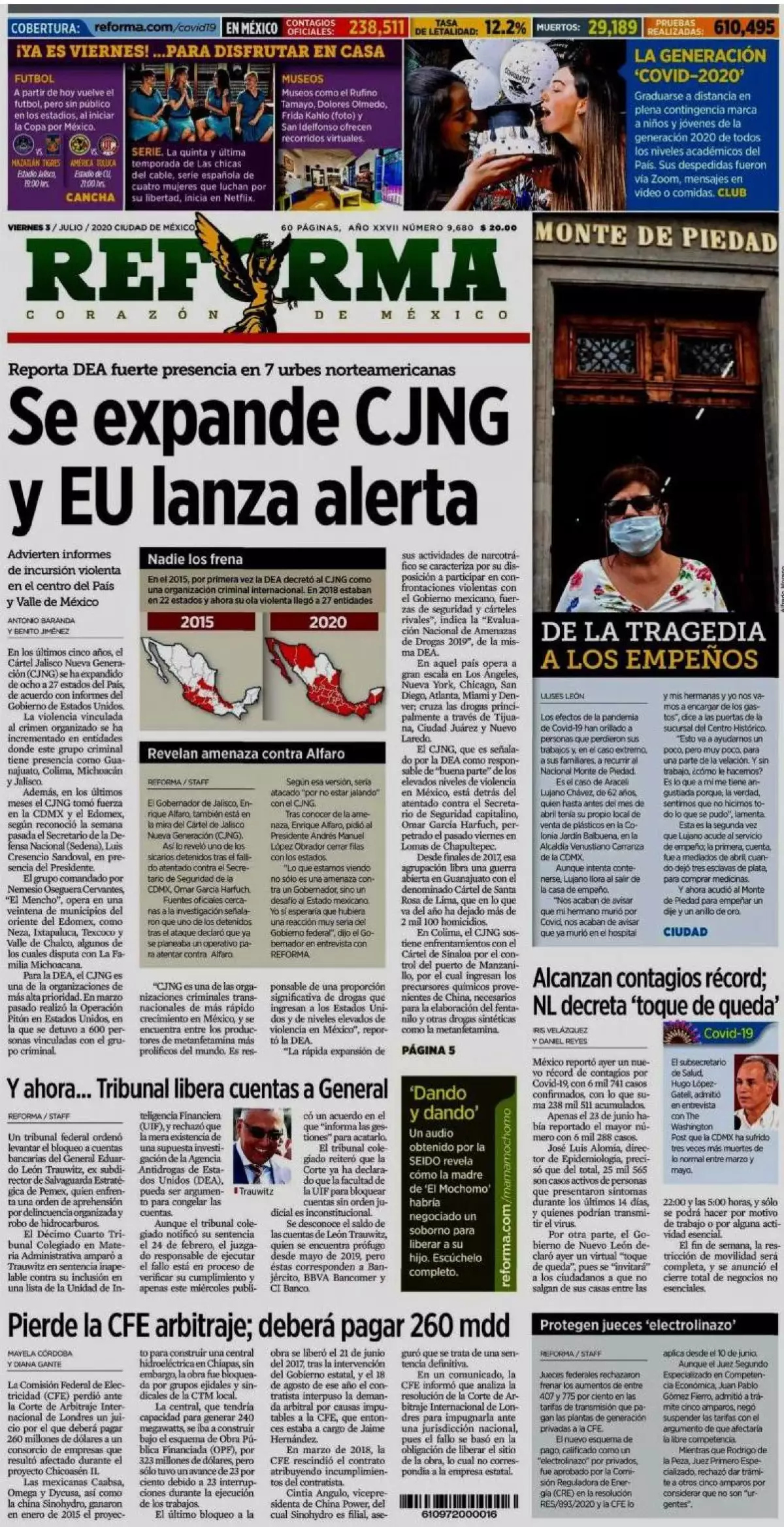 La violencia vinculada al crimen organizado se ha incrementado en entidades donde el Cártel Jalisco Nueva Generación (CJNG) tiene presencia como Guanajuato, Colima, Michoacán y Jalisco, publica Reforma. Además, en los últimos meses el CJNG tomó fuerza en la CDMX y el Edomex, según reconoció la semana pasada el Secretario de la Defensa Nacional (Sedena), Luis Cresencio Sandoval, en presencia del presidente.