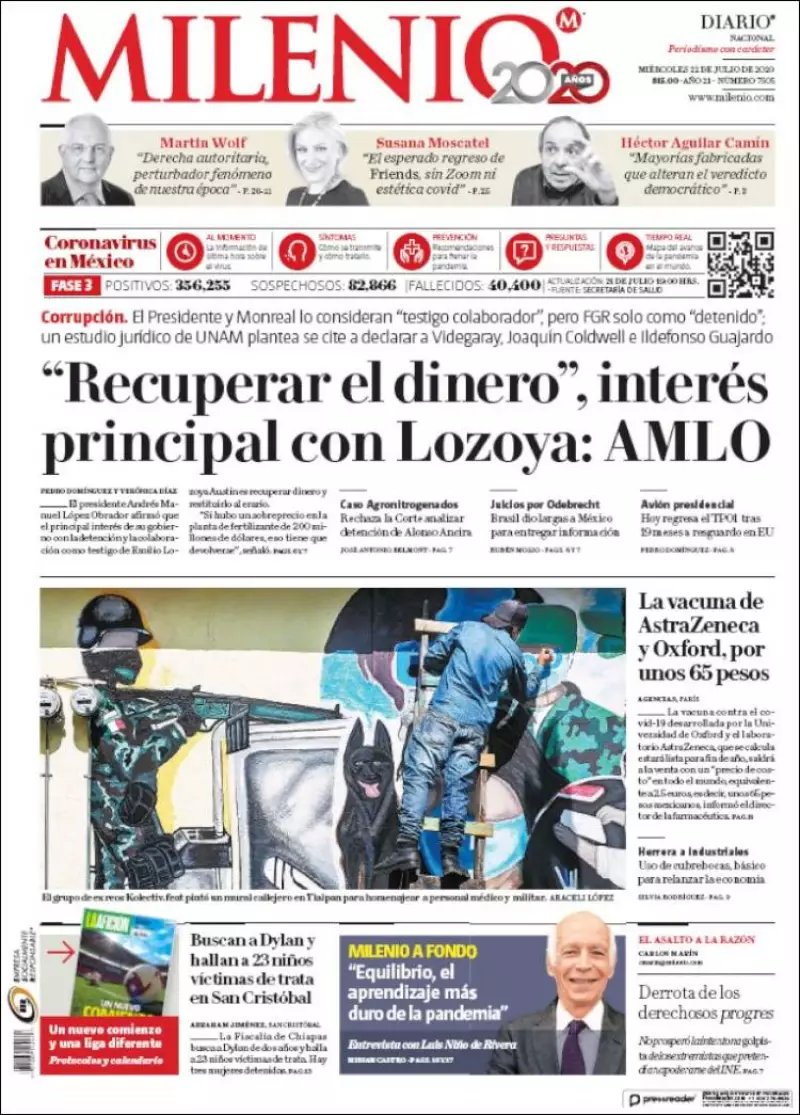 Emilio Lozoya Austin, exdirector de Pemex, permanece en un hospital del sur de la Ciudad de México, custodiado por elementos de la Agencia de Investigación Criminal (AIC) de la FGR, así como de la Guardia Nacional, y oficialmente no ha rendido ninguna declaración ministerial, publica La Jornada en uno de los temas de portada.