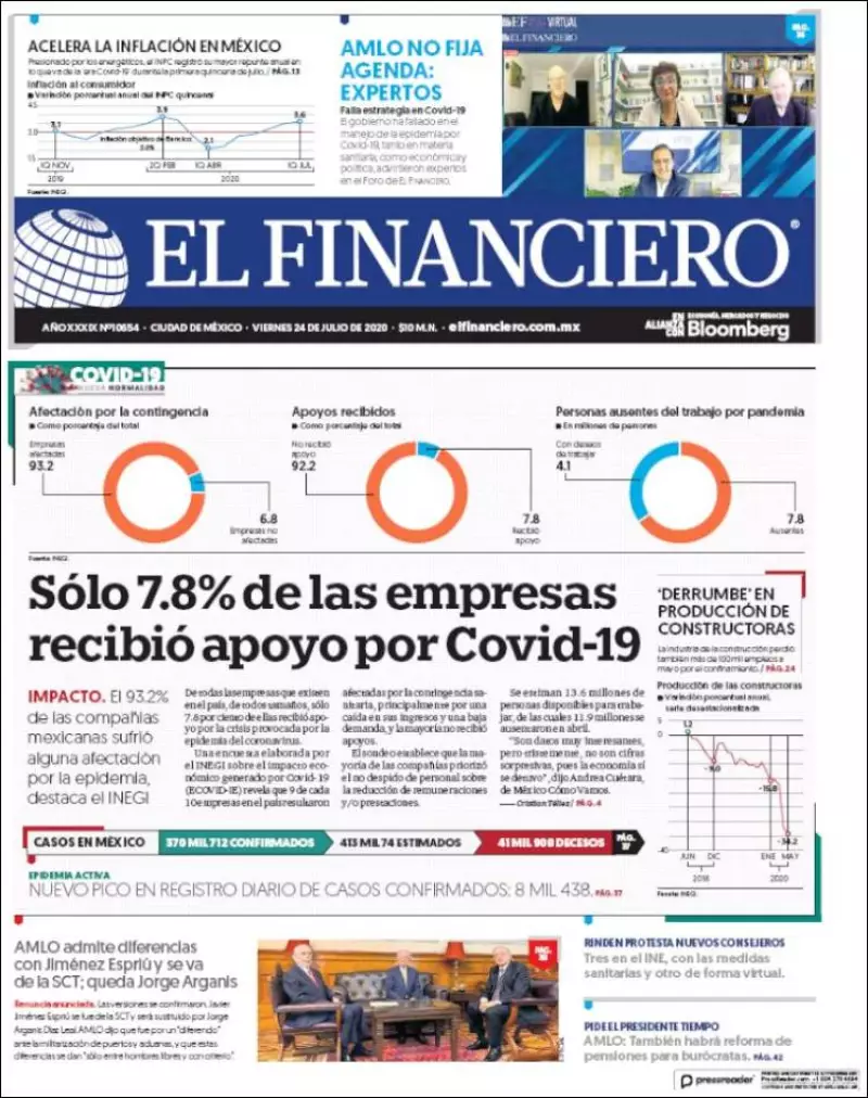 Nueve de cada diez empresas en el país resultaron afectadas por la contingencia sanitaria del COVID-19, sufriendo principalmente una caída en sus ingresos y una baja demanda, pese a esto, la mayoría no recibió apoyos, señala El Financiero. De acuerdo con la Encuesta sobre el Impacto Económico generado por COVID-19 (ECOVID-IE), solo 7.8% obtuvo algún tipo de apoyo, mientras que el resto, un 92.2%, no recibió ayuda de ninguna índole.