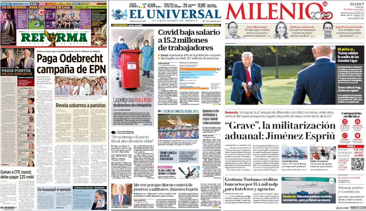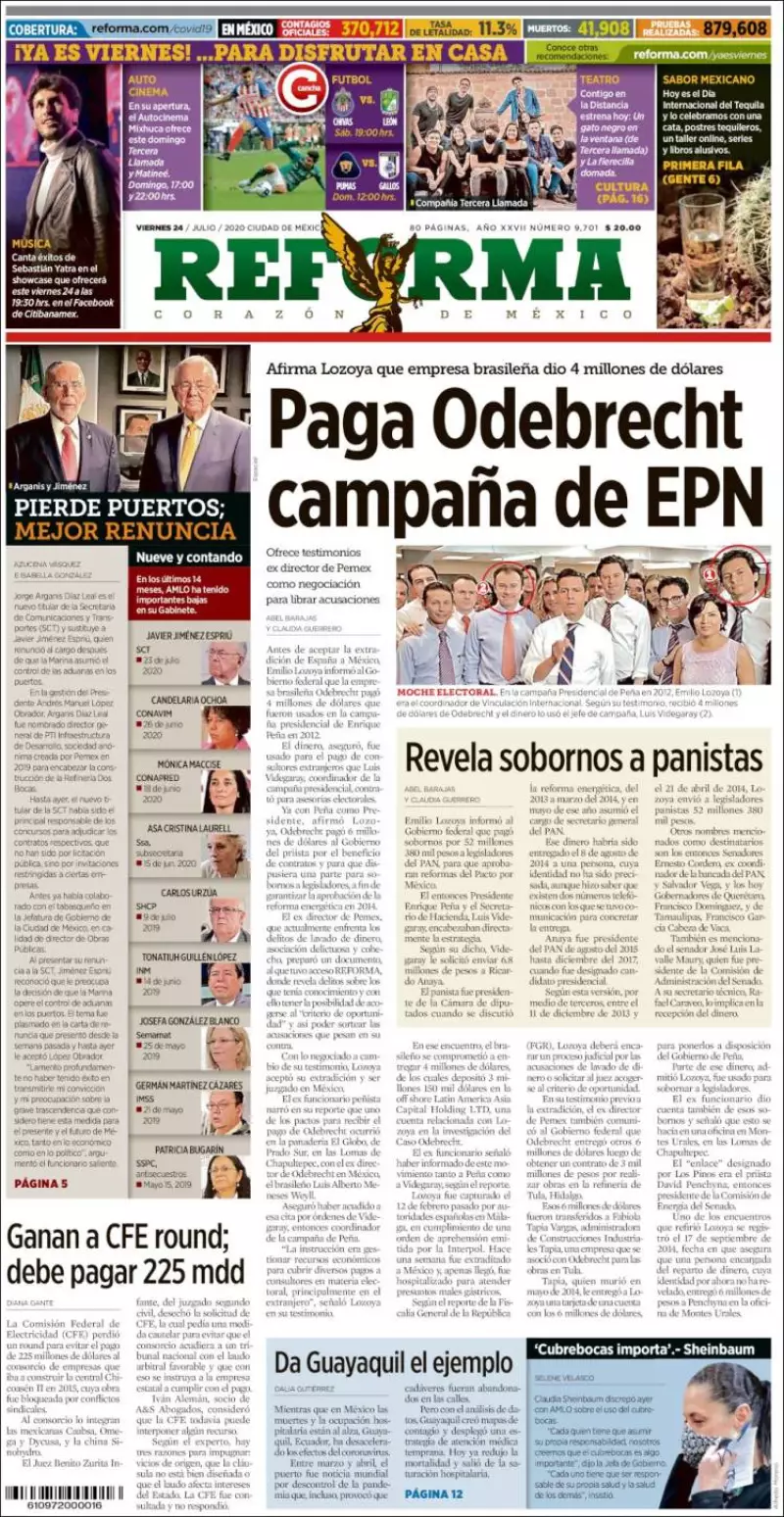 Antes de aceptar la extradición de España a México, Emilio Lozoya informó al Gobierno federal que la empresa brasileña Odebrecht pagó 4 millones de dólares que fueron usados en la campaña presidencial de Enrique Peña en 2012, revela Reforma en uno de los temas de portada.