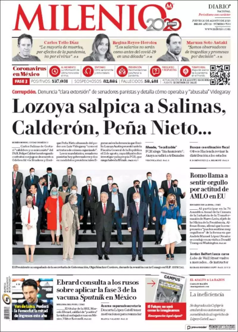 La bomba prometida finalmente detonó, señala Milenio . La denuncia que Emilio Lozoya presentó en la Fiscalía General de la República (FGR) se filtró ayer y reveló los alcances de un proceso judicial inédito en la historia política del país: sus acusaciones alcanzan a tres ex presidentes de México y cuatro ex secretarios de Estado, además de nueve legisladores, políticos y empresarios, presuntos responsables de recibir sobornos y beneficiarse con una red de favores a lo largo de una década.
