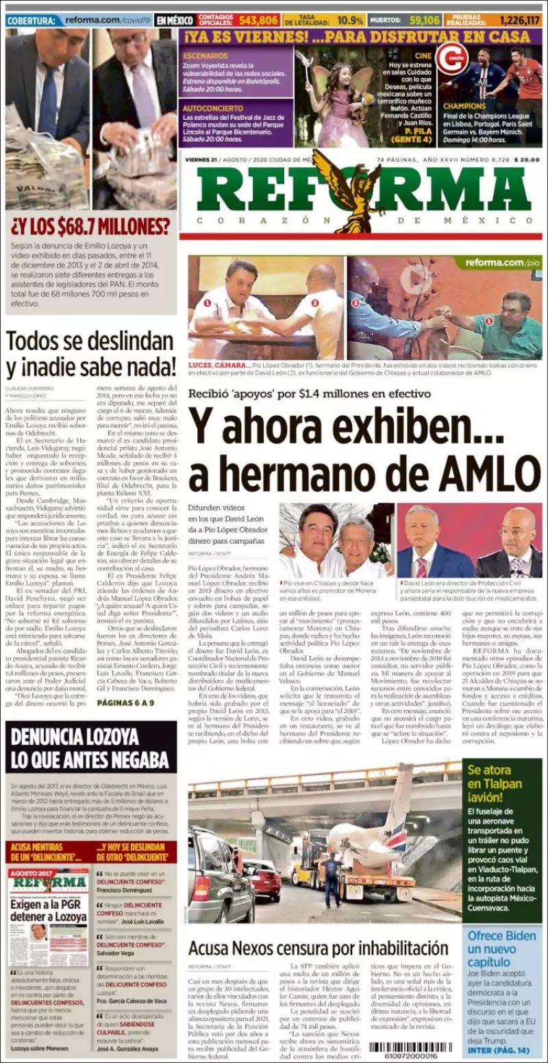 Pío López Obrador, hermano del Presidente Andrés Manuel López Obrador, recibió en el 2015 dinero en efectivo para campañas en bolsas de papel y sobres, según dos videos y un audio difundidos ayer por Latinus, sitio del periodista Carlos Loret de Mola, reseña Reforma en uno de los temas de portada.
