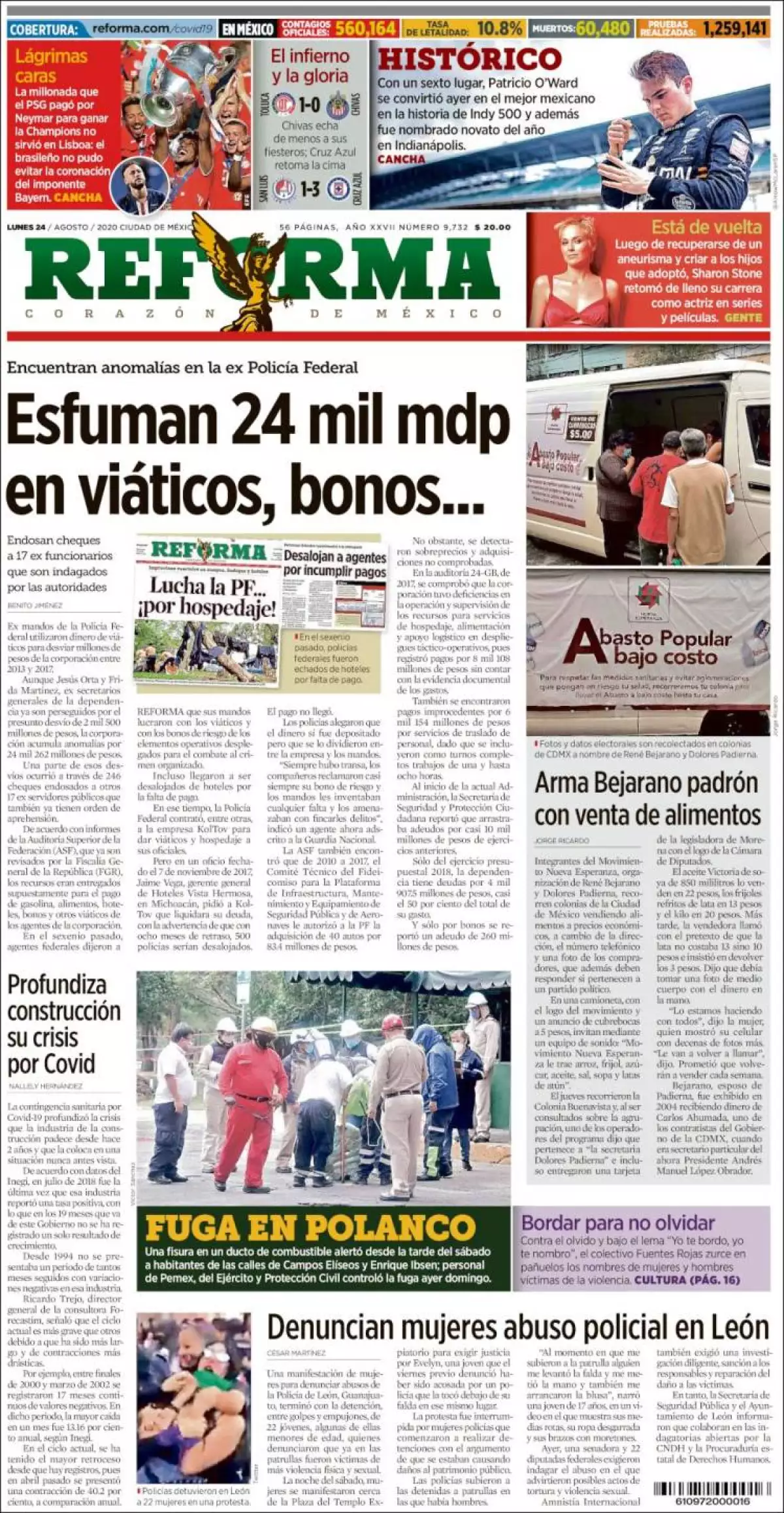 Exmandos de la Policía Federal utilizaron dinero de viáticos para desviar millones de pesos de la corporación entre 2013 y 2017, destaca Reforma. Aunque Jesús Orta y Frida Martínez, ex secretarios generales de la dependencia ya son perseguidos por el presunto desvío de 2 mil 500 millones de pesos, la corporación acumula anomalías por 24 mil 262 millones de pesos.