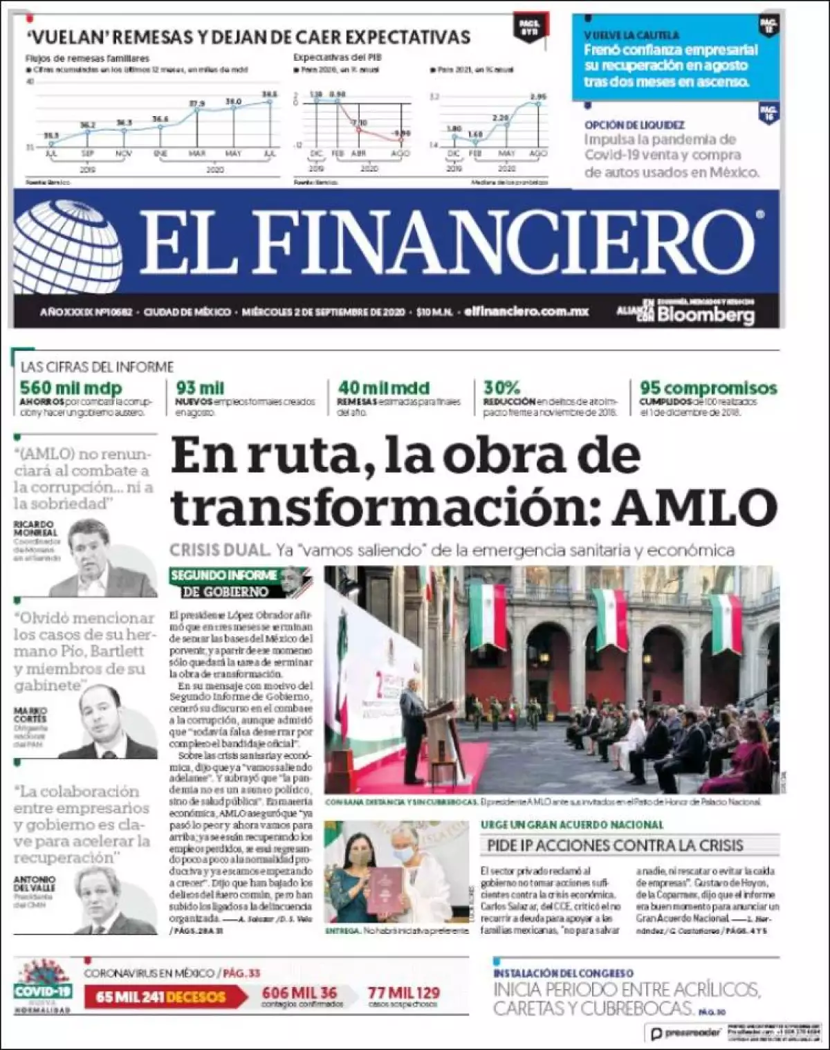 No hubo mañanera, pero sí discurso, describe El Financiero. Combate a la corrupción, mejora del sistema de salud, recuperación económica ante una doble crisis, e independencia de poderes. A pocos les sorprendió. En 50 minutos, el presidente Andrés Manuel López Obrador ensalzó un año de programas sociales, dijo tener el mejor gobierno para el peor momento, y auguró que su legado sería el “purificar la vida pública de México”.