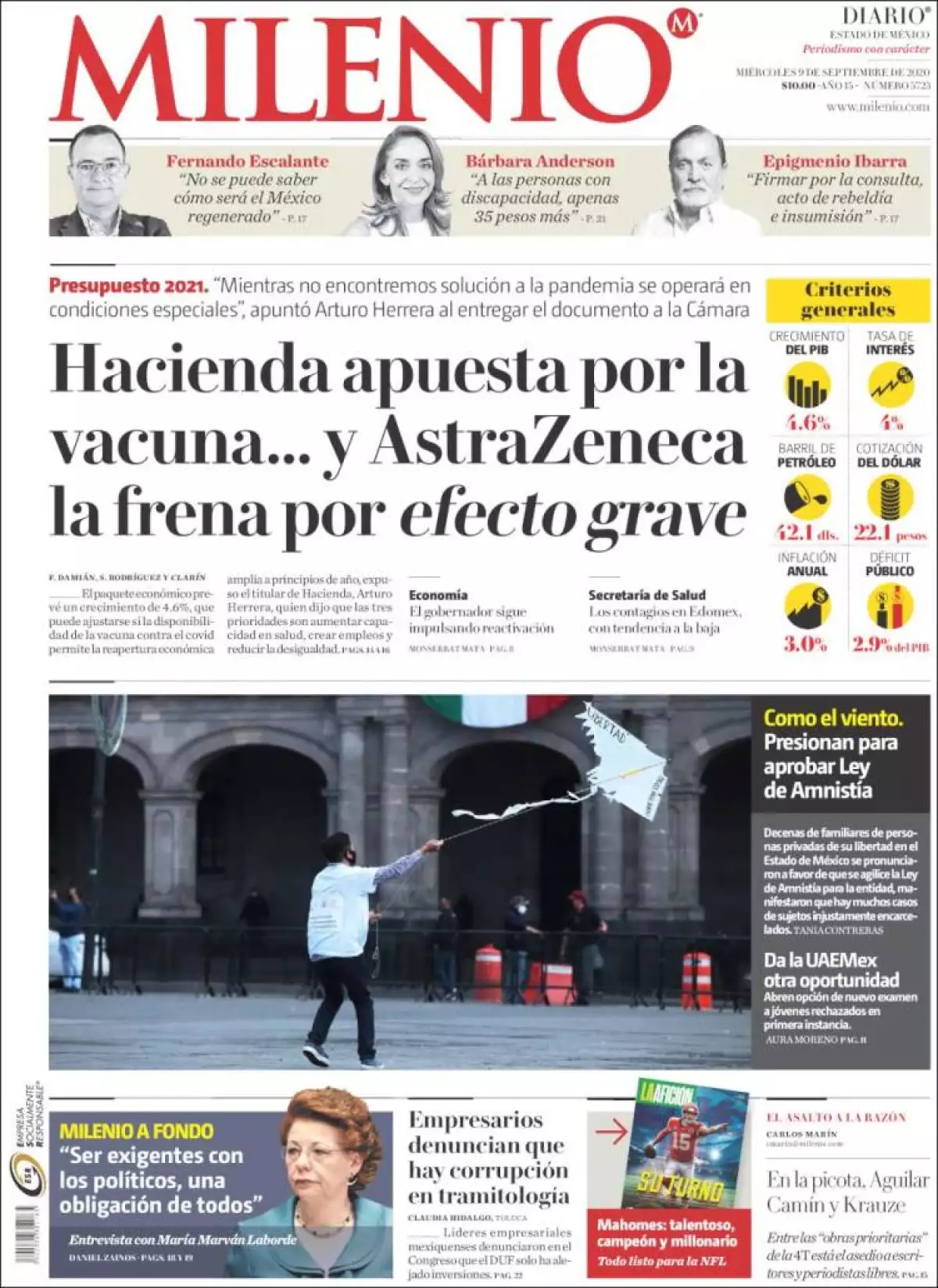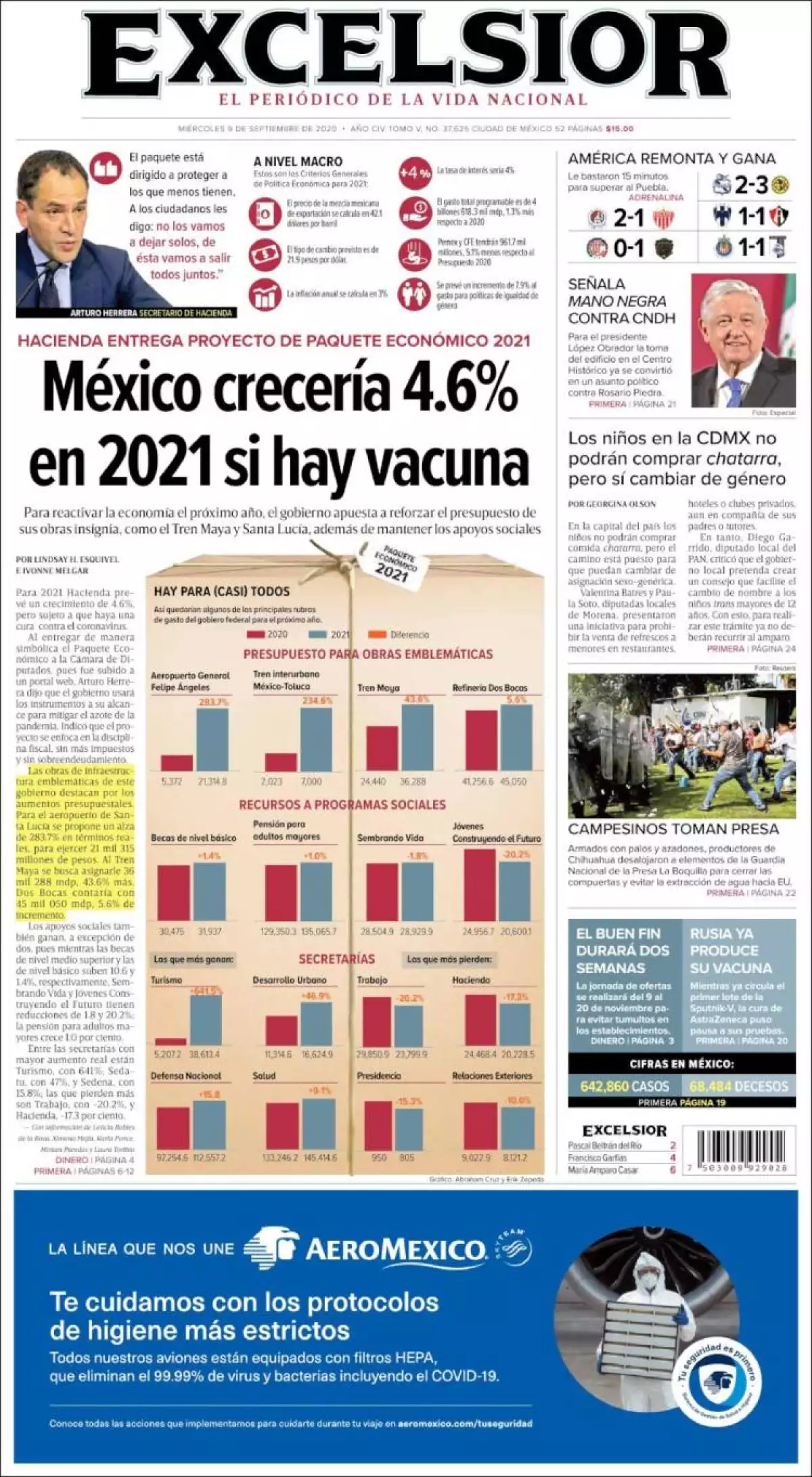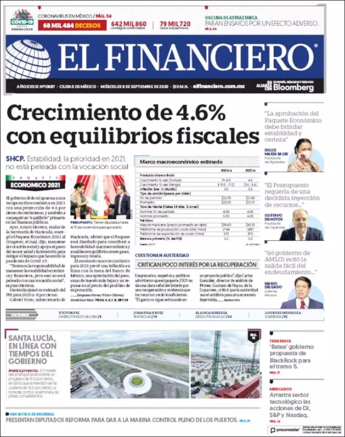 Para 2021 Hacienda prevé un crecimiento de 4.6%, pero sujeto a que haya una cura contra el coronavirus, indica Excélsior. Al entregar de manera simbólica el Paquete Económico a la Cámara de Diputados, pues fue subido a en un portal web, Arturo Herrera dijo que el gobierno usará los instrumentos a su alcance para mitigar el azote de la pandemia. Indicó que el proyecto se enfoca en la disciplina fiscal, sin más impuestos y sin sobreendeudamiento.