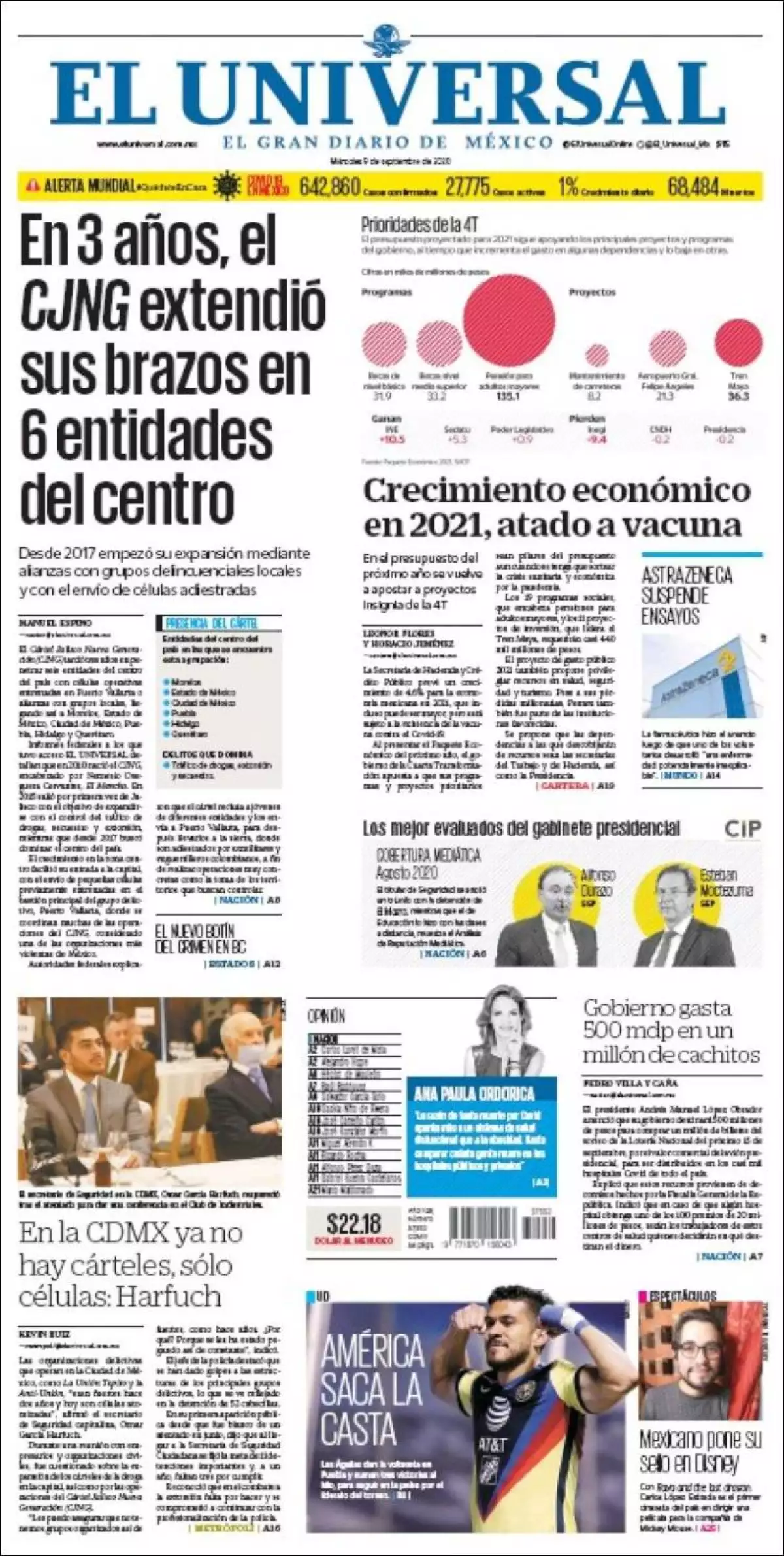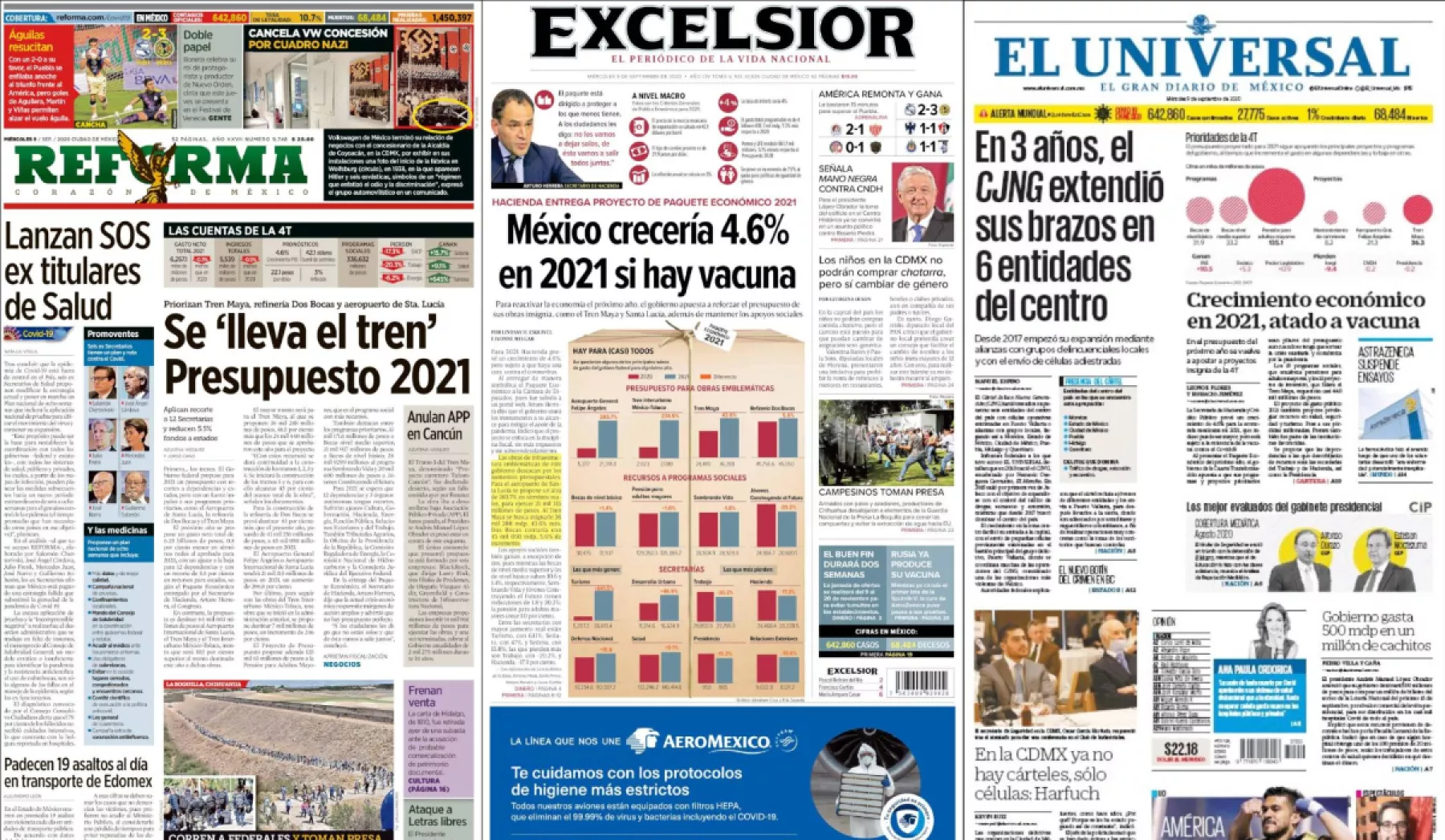 El Gobierno federal propuso para 2021 un presupuesto con recortes a dependencias y estados, pero con un fuerte impulso a sus programas prioritarios, como el Aeropuerto de Santa Lucía, la refinería de Dos Bocas y el Tren Maya, consigna Reforma en uno de los temas de portada.