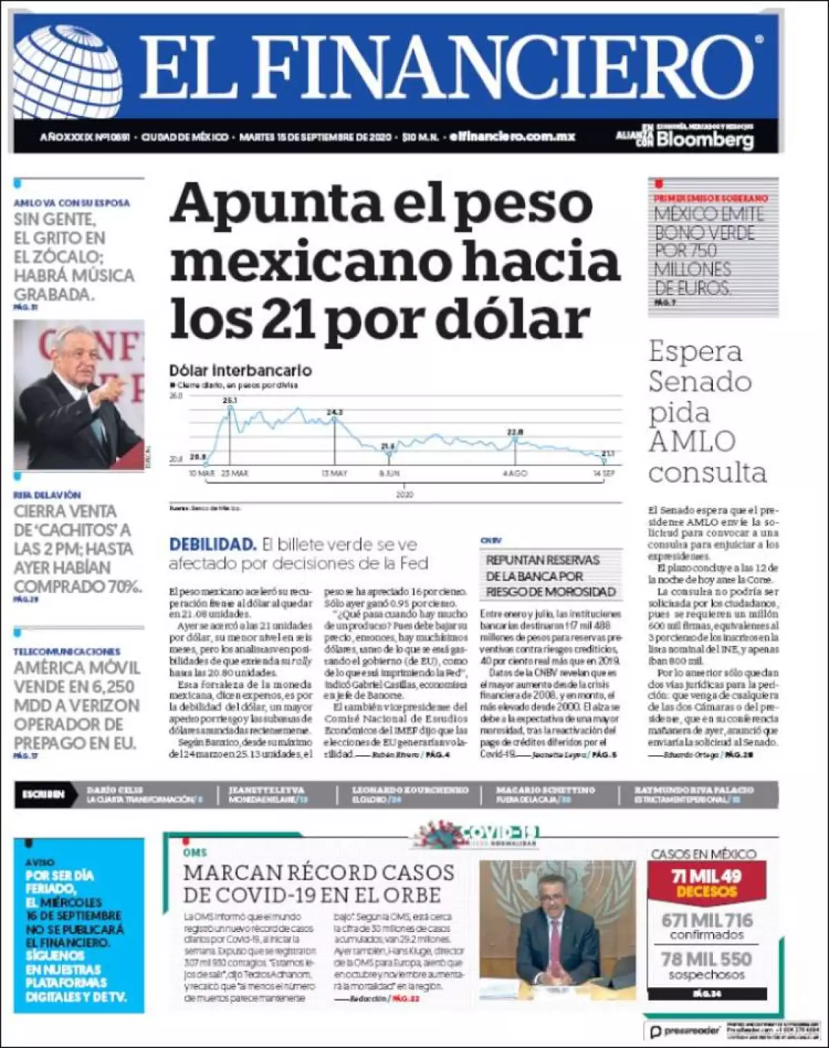 El peso mexicano aceleró su recuperación frente al dólar en las últimas jornadas y el lunes rozó las 21 unidades, su menor nivel en seis meses, y los analistas ven posibilidades de que extienda su rally hacia las 20.80 unidades, indica El Financiero. El debilitamiento generalizado del dólar, un mayor apetito por el riesgo y las subastas de dólares que se anunciaron recientemente, están detrás de la fortaleza del peso.
