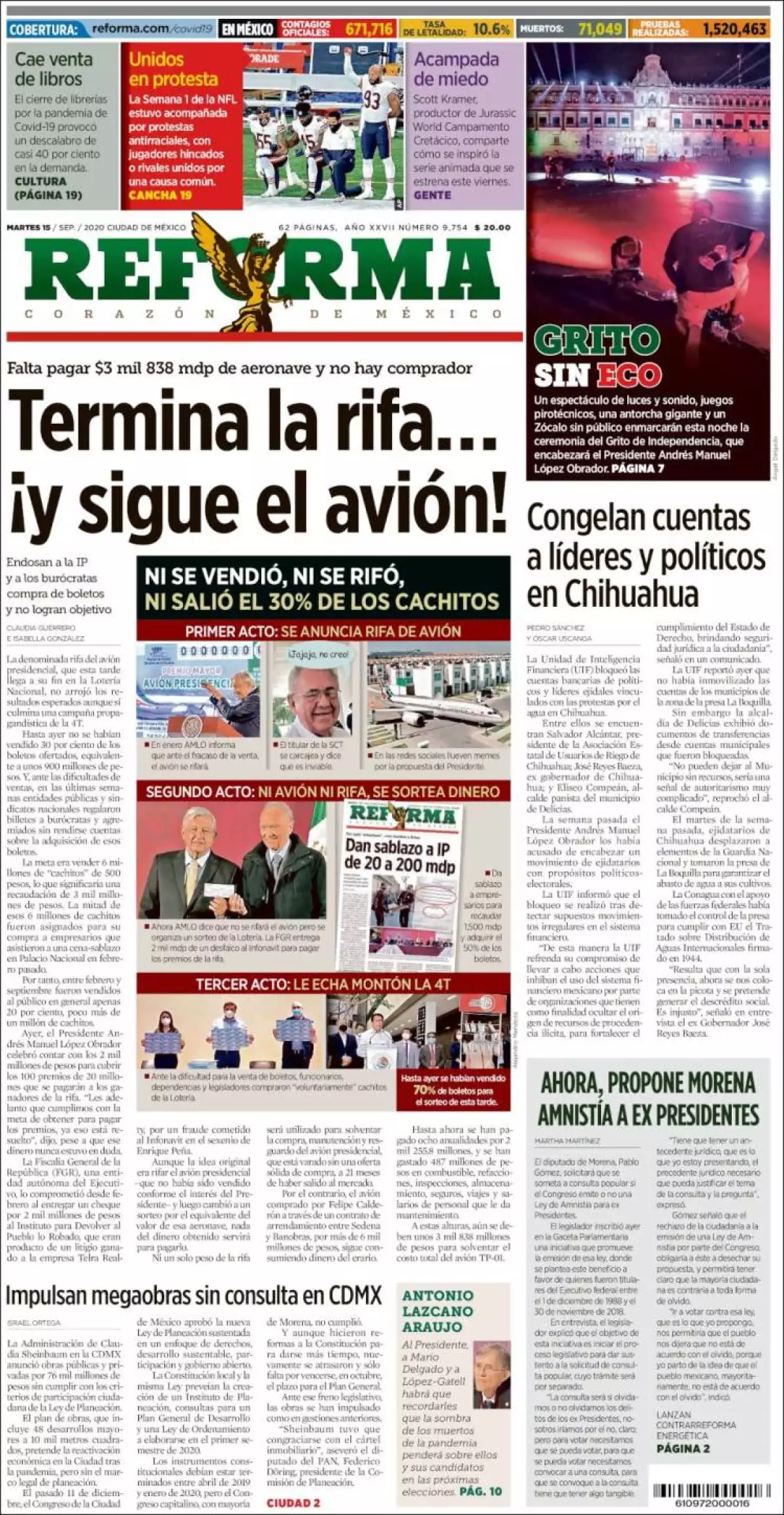 La denominada rifa del avión presidencial, que esta tarde llega a su fin en la Lotería Nacional, no arrojó los resultados esperados aunque sí culmina una campaña propagandística de la 4T, señala Reforma. Hasta ayer no se habían vendido 30% de los boletos ofertados, equivalente a unos 900 millones de pesos. Y, ante las dificultades de ventas, en las últimas semanas entidades públicas y sindicatos nacionales regalaron billetes a burócratas y agremiados sin rendirse cuentas sobre la adquisición de esos boletos.