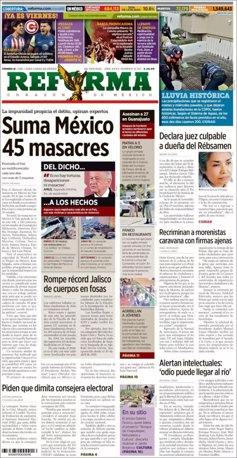 Pese al discurso oficial, las masacres en México no han cesado. En lo que va del año se han registrado al menos 45 casos en donde, en un mismo hecho, han asesinado a sangre fría a cinco o más personas en 20 estados, indica Reforma. En total, las masacres en México le han quitado la vida este año a 320 personas en los estados de Guanajuato, Michoacán, Guerrero, Puebla, Durango, Zacatecas, Veracruz, Tamaulipas, Jalisco, Baja California, Chihuahua, Morelos, Colima, Nuevo León, Sonora, Oaxaca, Estado de México, Chiapas, Tabasco y San Luis Potosí.
