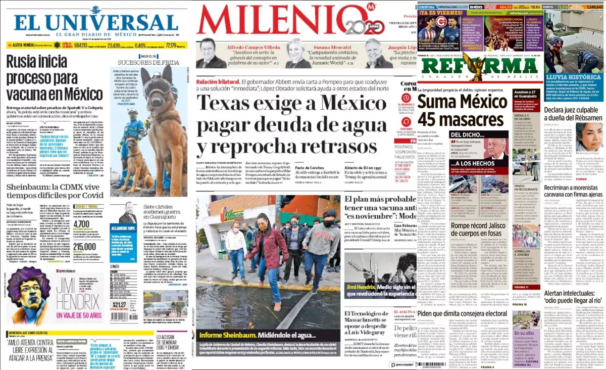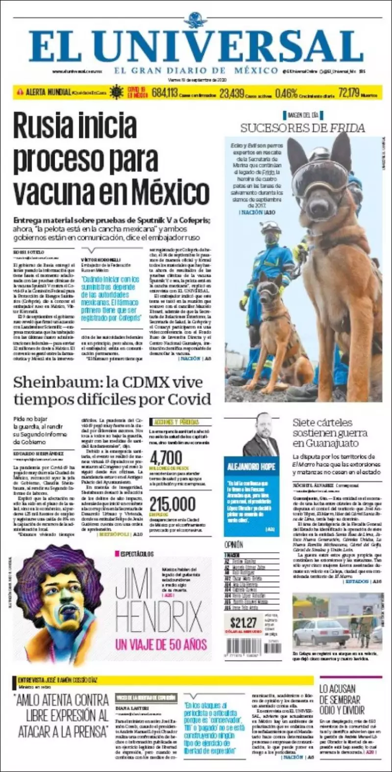 El gobierno de Rusia entregó el lunes pasado la información que tiene hasta el momento relacionada con las pruebas clínicas de la vacuna Sputnik V contra el COVID-19 a la Comisión Federal para la Protección de Riesgos Sanitarios (Cofepris), refiere El Universal en uno de los temas de portada.