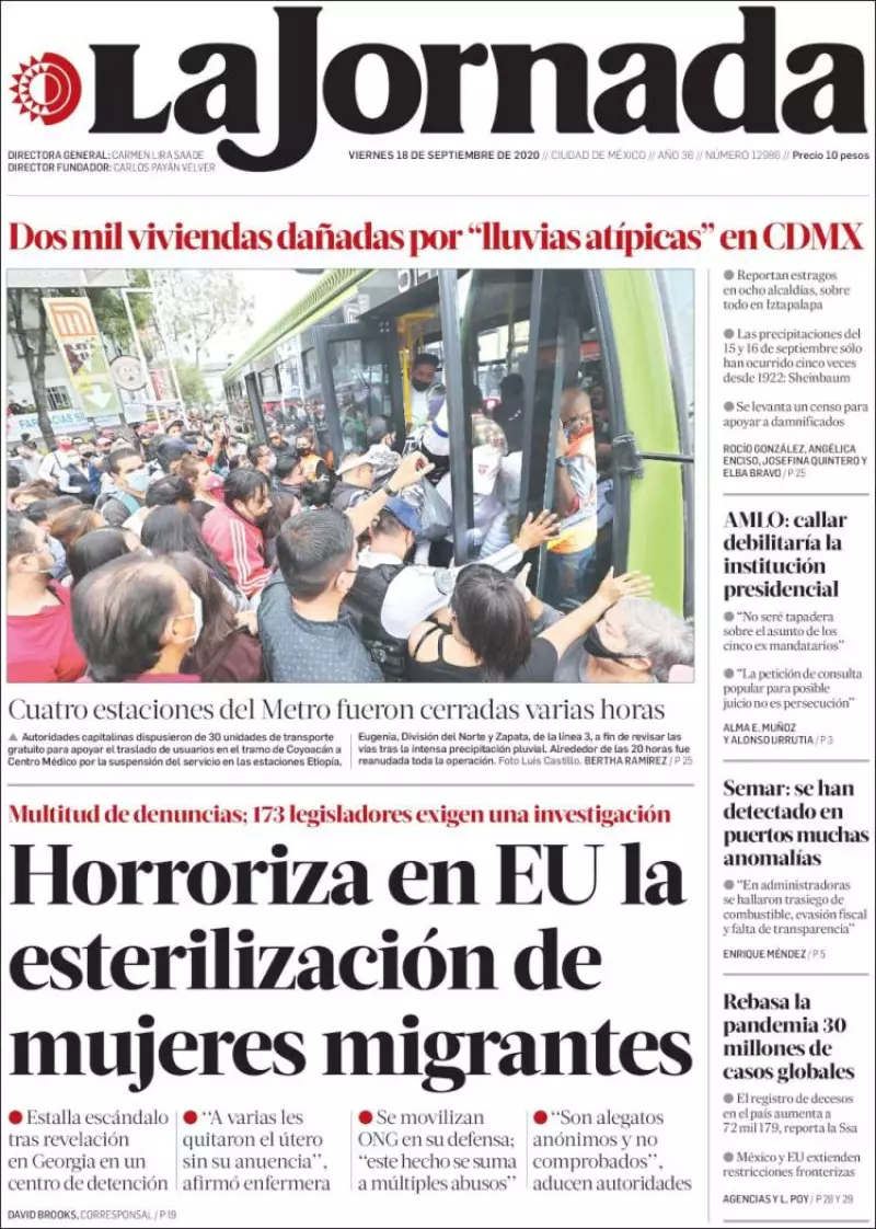 Una denuncia sobre posibles histerectomías masivas practicadas sin consentimiento de las afectadas en un centro de detención de migrantes estalló a principios de semana, destaca La Jornada . Esto y otros maltratos médicos fueron la gota que derramó el vaso de una multitud de denuncias, incluida la demanda de una investigación de más de 170 legisladores sobre las violaciones y abusos de derechos humanos y civiles generados por las políticas antimigrantes del gobierno de Donald Trump.