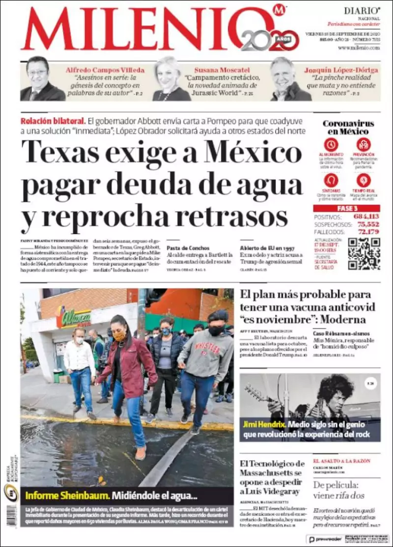 A México le quedan solo 38 días para pagar a Estados Unidos 319 millones de metros cúbicos de agua, volumen cercano a la cuota establecida para un año en el Tratado de Aguas de 1944, a través del cual se distribuyen las aguas internacionales de los tres ríos que compartimos a lo largo de la frontera: Colorado, Tijuana y Bravo, refiere Milenio , y a pesar de que el tratado es más favorable para nuestro país, ya que por cada litro de agua que México aporta a Estados Unidos, nosotros recibimos 4 litros de agua.