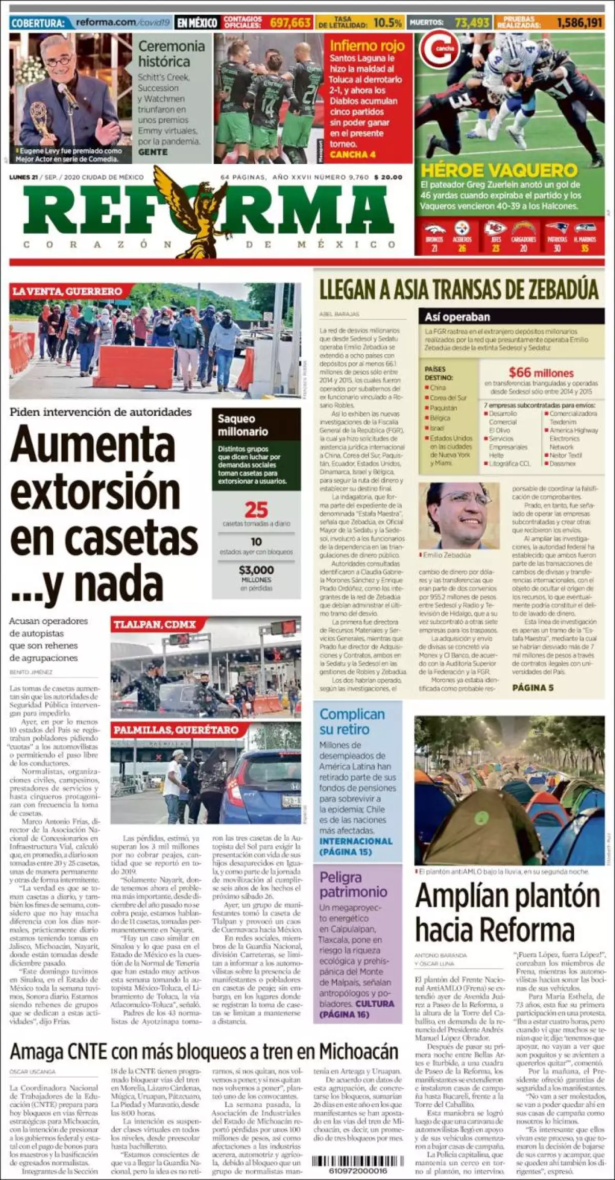 Las tomas de casetas aumentan sin que las autoridades de Seguridad Pública intervengan para impedirlo, señala Reforma . Ayer, en por lo menos 10 estados del país se registraban pobladores pidiendo “cuotas” a los automovilistas o permitiendo el paso libre de los conductores.