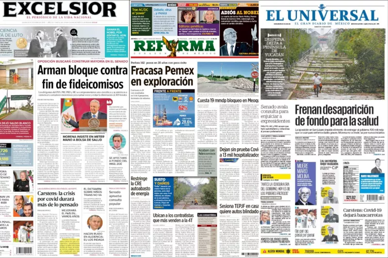 Los dirigentes del PAN, PRI, PRD y MC se comprometieron ante científicos y académicos a convencer a senadores morenistas para sumar votos y evitar la eliminación de 109 fondos, señala Excélsior en uno de los temas de portada.