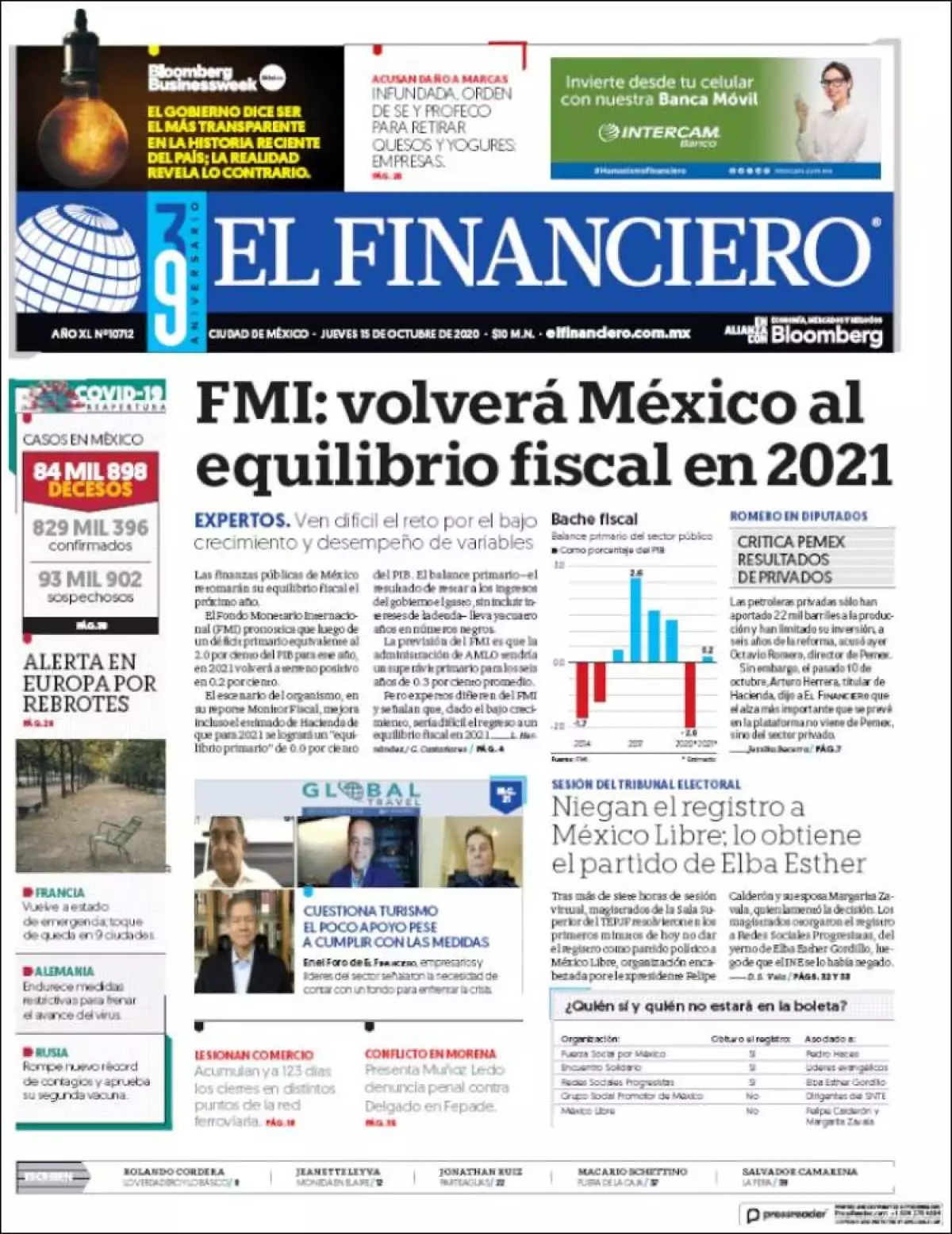 Las finanzas públicas de México retomarán su equilibrio fiscal el próximo año, luego de un déficit primario equivalente al 2.0% del PIB en 2020, según proyecciones del Fondo Monetario Internacional (FMI). En su reporte Monitor Fiscal, indica El Financiero , estima que el próximo año este indicador regrese al terreno positivo en 0.2%.