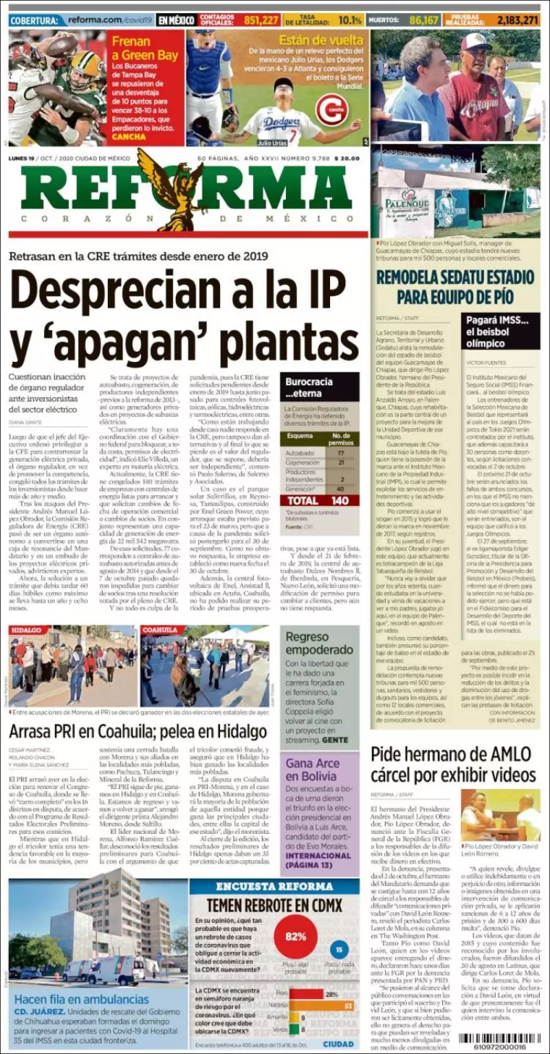 En el último año de gestión del general Salvador Cienfuegos al frente de la Secretaría de la Defensa Nacional (Sedena), la institución otorgó, en adjudicación directa, un contrato por más de 20 millones de pesos a Arturo Ávila Anaya, promotor de Andrés Manuel López Obrador en la campaña de 2018 y aspirante a la alcaldía de Aguascalientes por Morena en 2019, señala El Universal en uno de los temas de portada.
