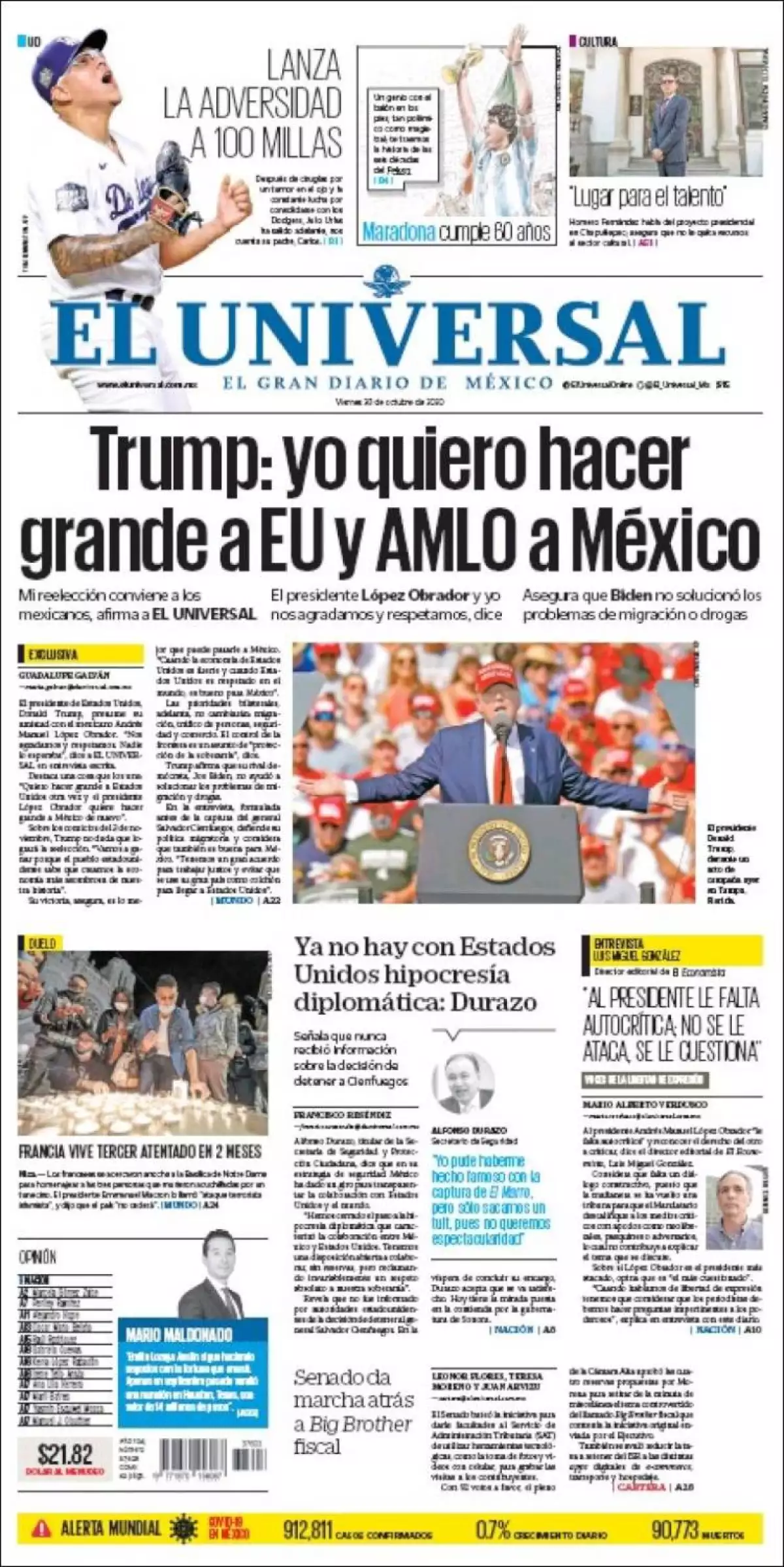 El presidente de Estados Unidos, Donald Trump, presume su amistad con el mexicano Andrés Manuel López Obrador. "Nos agradamos y respetamos. Nadie lo esperaba", dice a El Universal en entrevista escrita. Destaca una cosa que los une: "Quiero hacer grande a Estados Unidos otra vez y el presidente López Obrador quiere hacer grande a México de nuevo".