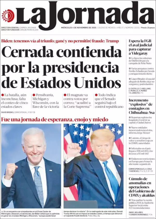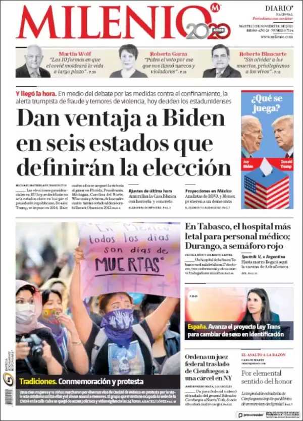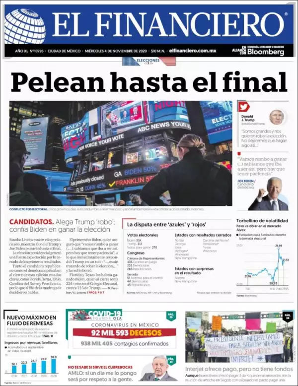 La elección nacional –posiblemente la más concurrida en un siglo– quedó inconclusa con una competencia más cerrada de lo esperado entre Donald Trump y Joe Biden y con el triunfo en manos de unos cinco estados claves que siguen contando las boletas, proceso que podría alargarse días, refieren los medios mexicanos en el principal tema de portada.