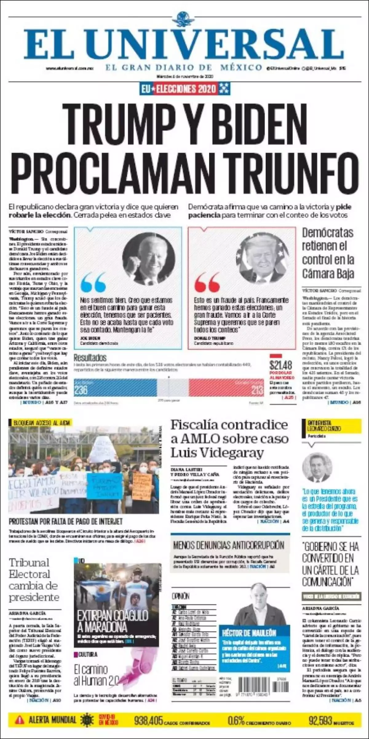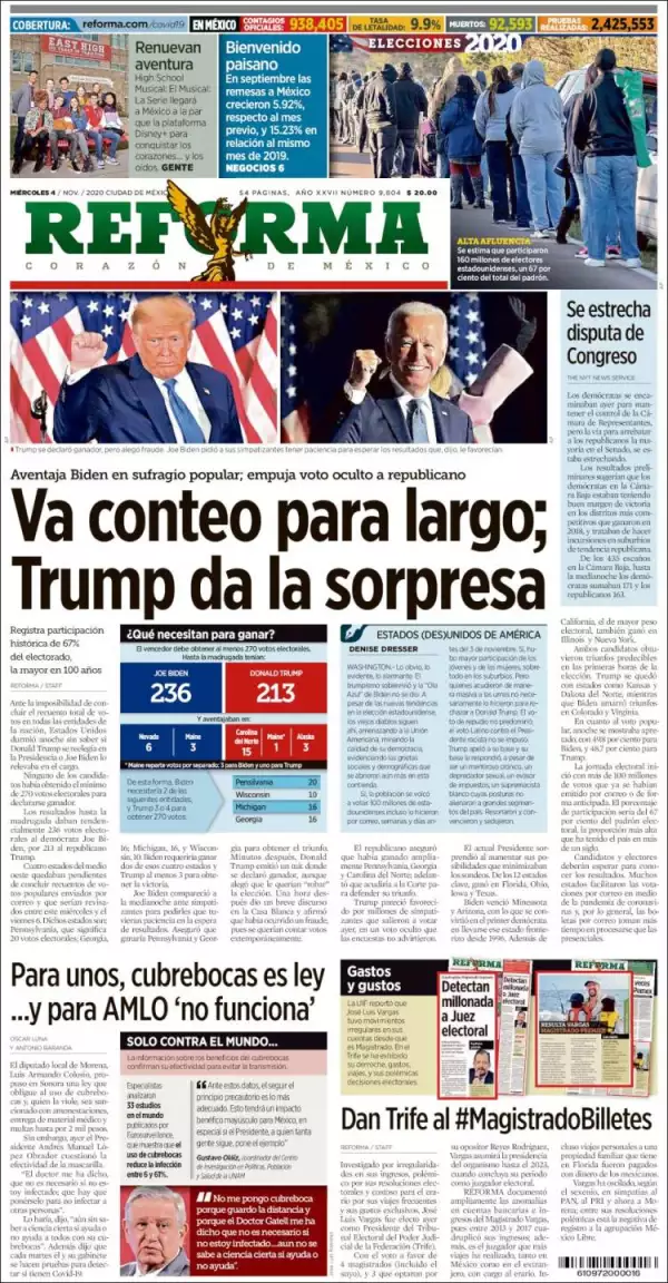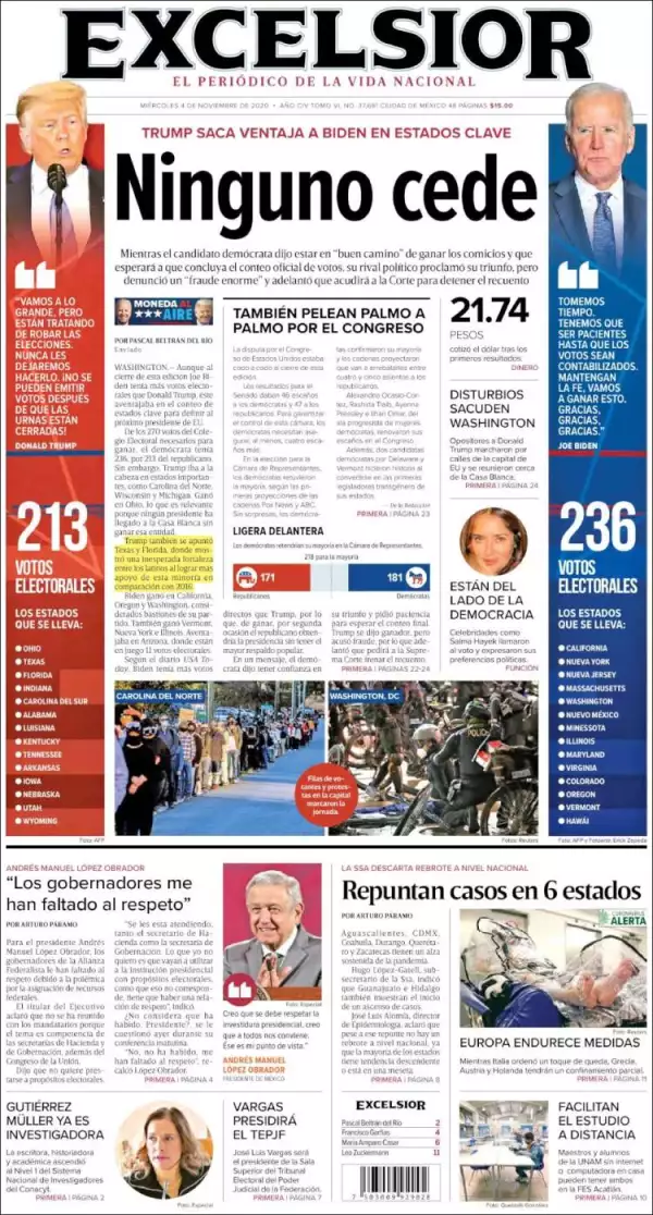 Aunque Joe Biden tiene más votos electorales que Donald Trump, éste aventajaba en el conteo de estados clave para definir al próximo presidente de EU, señala Excélsior . De los 270 votos del Colegio Electoral necesarios para ganar, el demócrata tenía 236, por 213 del republicano. Sin embargo, Trump iba a la cabeza en estados importantes, como Carolina del Norte, Wisconsin y Michigan. Ganó en Ohio, lo que es relevante porque ningún presidente ha llegado a la Casa Blanca sin ganar esa entidad.