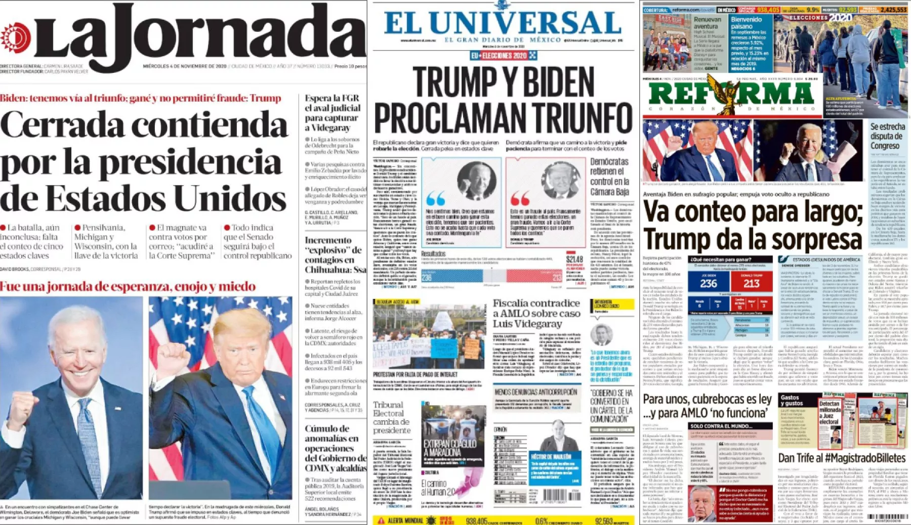 Ante la imposibilidad de concluir el recuento total de votos en todas las entidades de la nación, Estados Unidos durmió anoche sin saber si Donald Trump se reelegía en la presidencia o Joe Biden lo relevaba en el cargo, señala Reforma . Ninguno de los candidatos había obtenido el mínimo de 270 votos electorales para declararse ganador.
