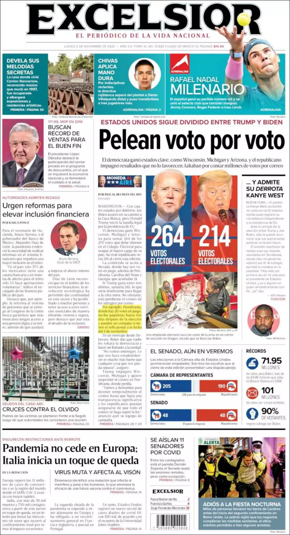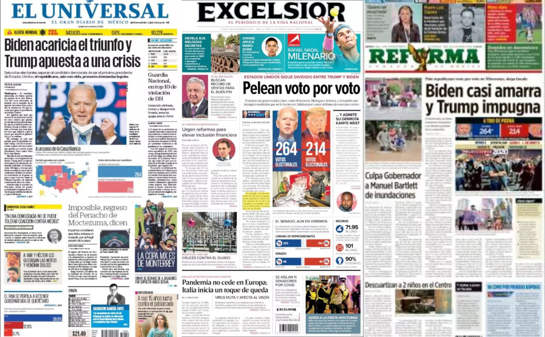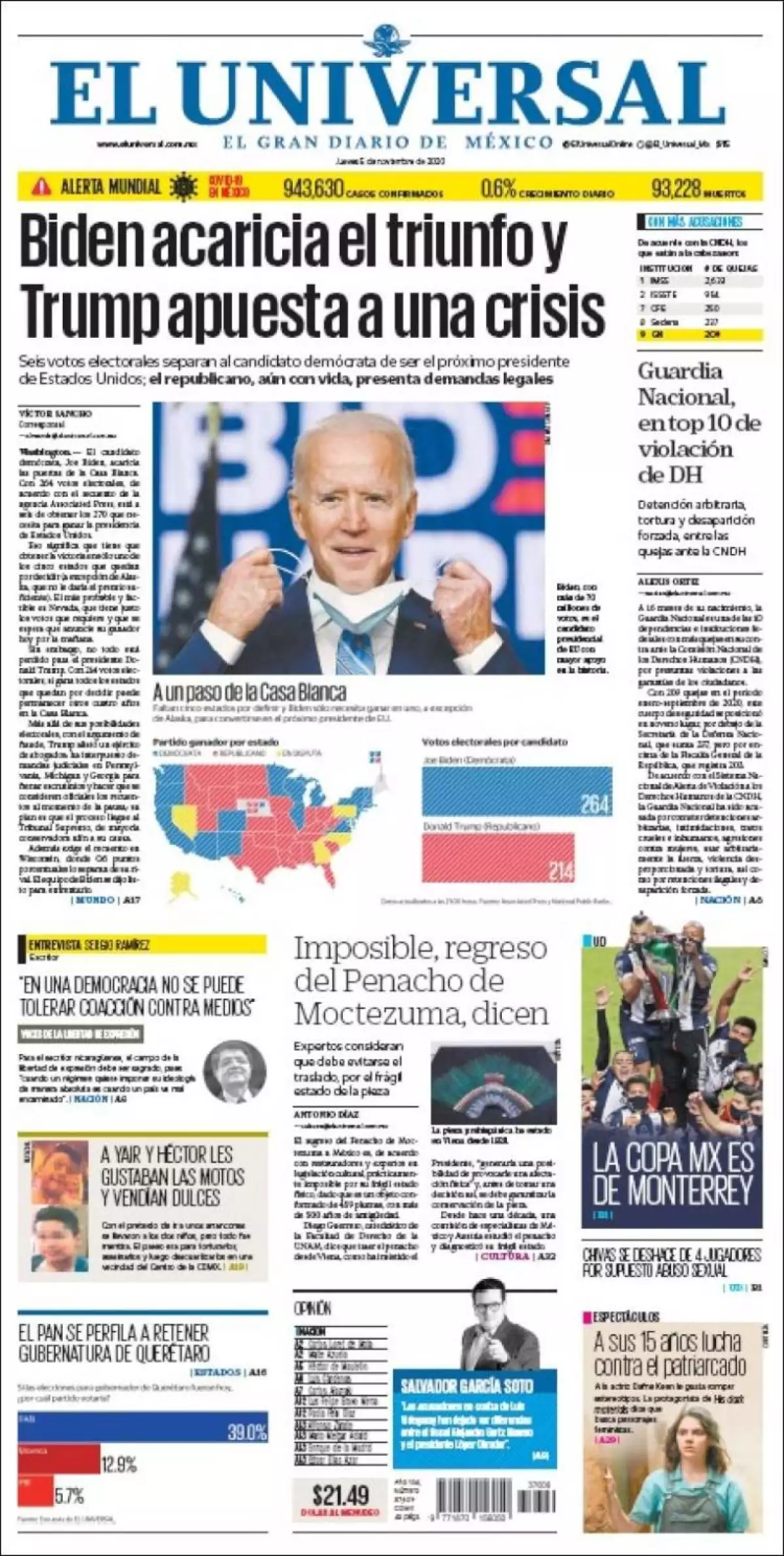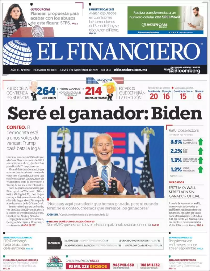 El candidato demócrata, Joe Biden, acaricia las puertas de la Casa Blanca. Con 264 votos electorales, de acuerdo con el recuento de la agencia Associated Press, está a seis de obtener los 270 que necesita para ganar la presidencia de Estados Unidos, consigna la prensa mexicana en el tema principal de las portadas.