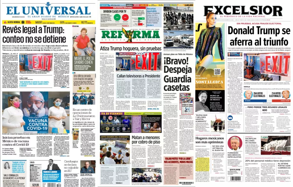 Mientras el presidente Donald Trump insistió ayer en que hubo fraude y su equipo de campaña presentó una serie de demandas para detener el conteo de votos, sin lograrlo hasta ahora, el candidato Joe Biden se mostró confiado, pidió calma y dijo que él y la senadora Kamala Harris serán “los ganadores”, refiere la prensa mexicana en el principal tema de las portadas.