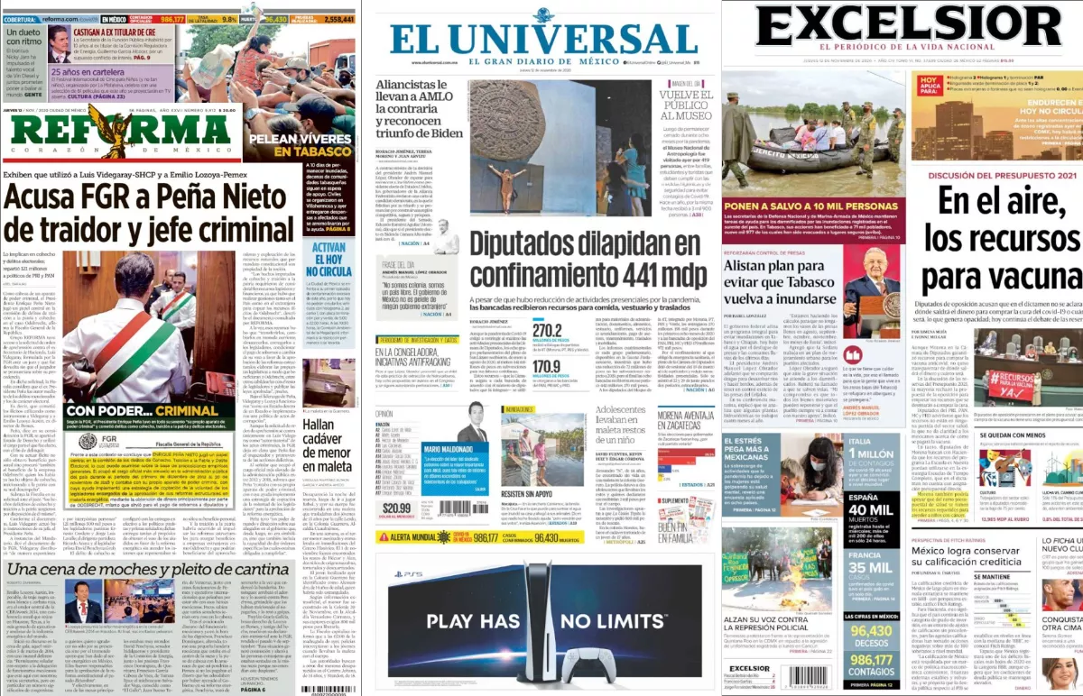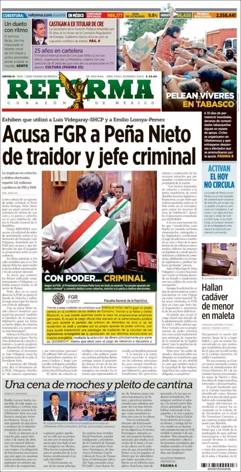 Como cabeza de un aparato de poder criminal, el expresidente Enrique Peña Nieto jugó un papel central en la comisión de delitos de traición a la patria y cohecho en el caso Odebrecht, afirma la Fiscalía General de la República, según consigna Reforma en el principal tema de portada.