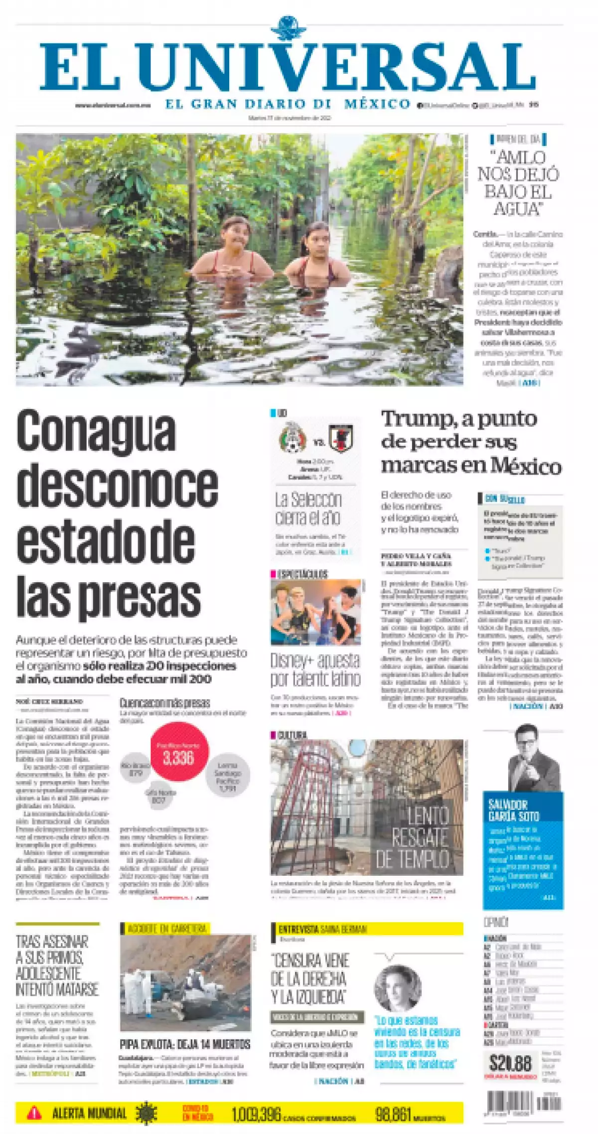 La decisión de optar entre inconvenientes a fin de evitar que se inundara Villahermosa y canalizar el caudal del agua a las zonas bajas obedeció a que no ha habido un buen control de las presas, aseveró el presidente Andrés Manuel López Obrador, quien anunció que se corregirá mediante decreto para modificar su forma de operar, refiere La Jornada. “Medimos que se iban a ir al agua estas comunidades (de la zona baja de Tabasco), pero no como en otras ocasiones, ya el volumen del agua era menor”.