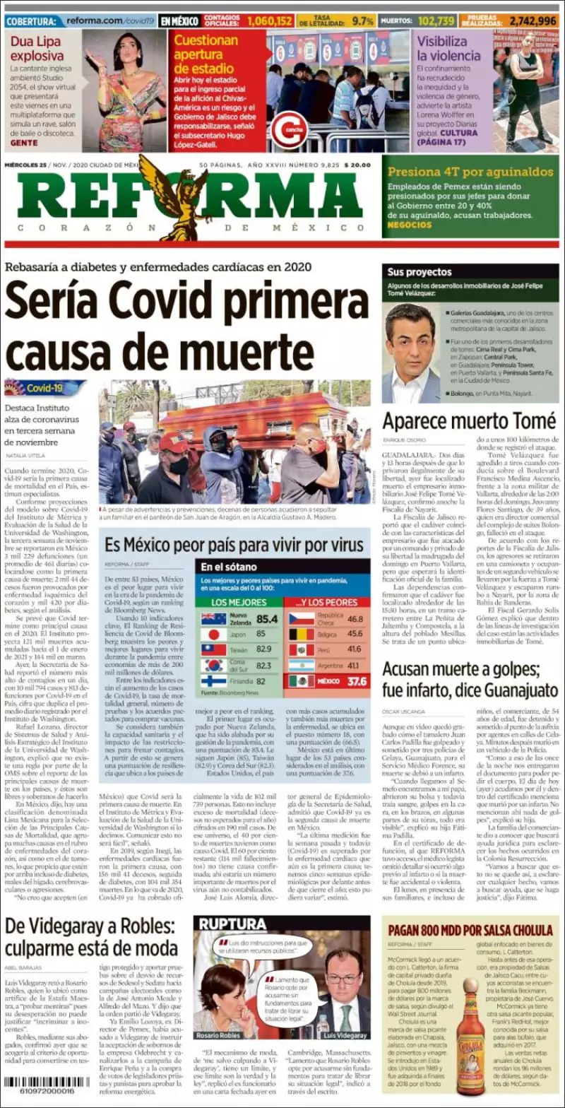Cuando termine 2020, Covid 19 podría ser la primera causa de mortalidad en el país, estiman especialistas. De acuerdo con las últimas proyecciones del modelo sobre Covid-19 del Instituto de Métrica y Evaluación de la Salud de la Universidad de Washington, indica Reforma , la tercera semana de noviembre se reportaron más de 3 mil 229 defunciones (un promedio de 461 diarios) con lo que se colocó en la primera causa de muerte, y se prevé que sea la principal causa en el 2020.