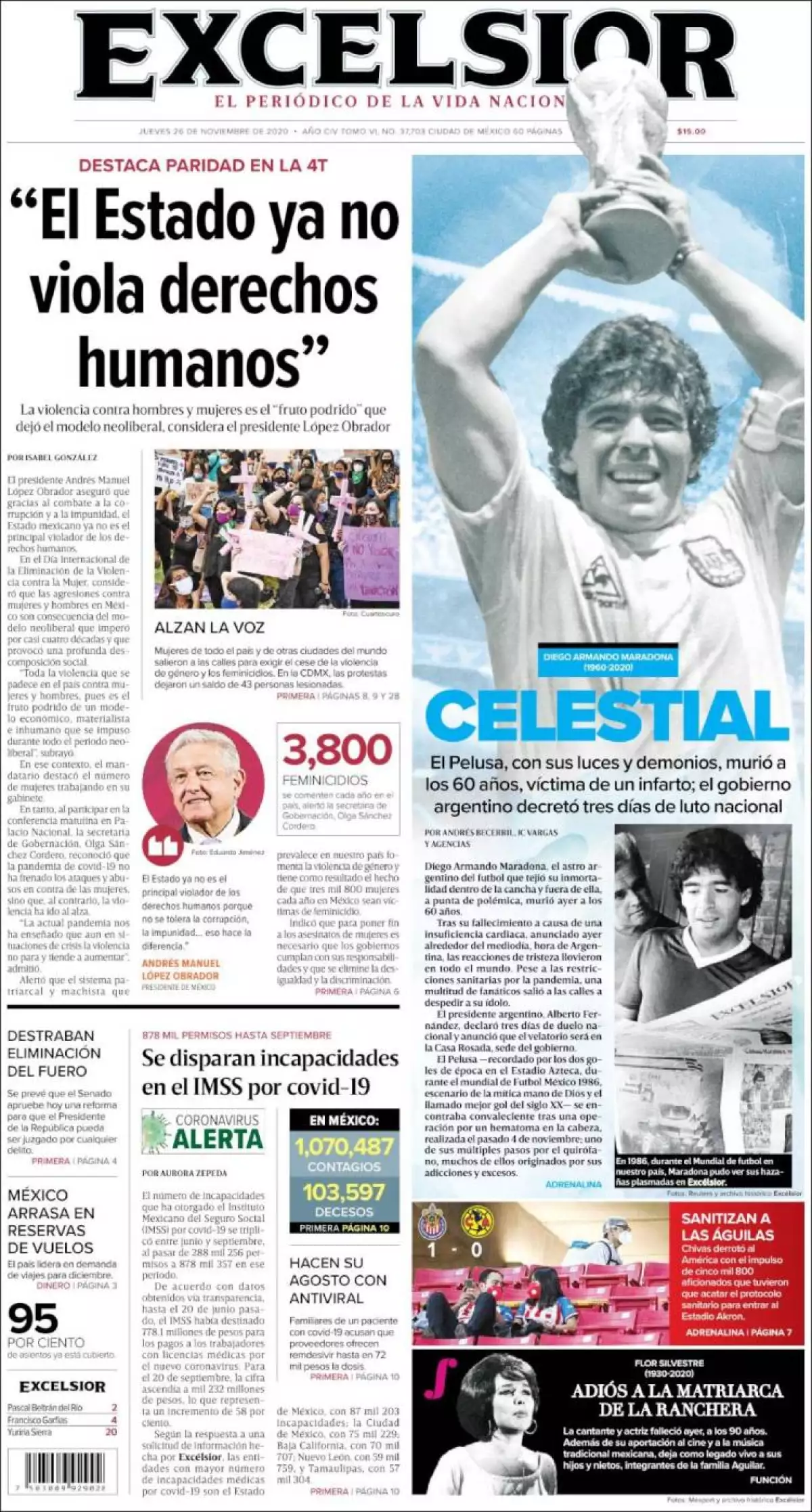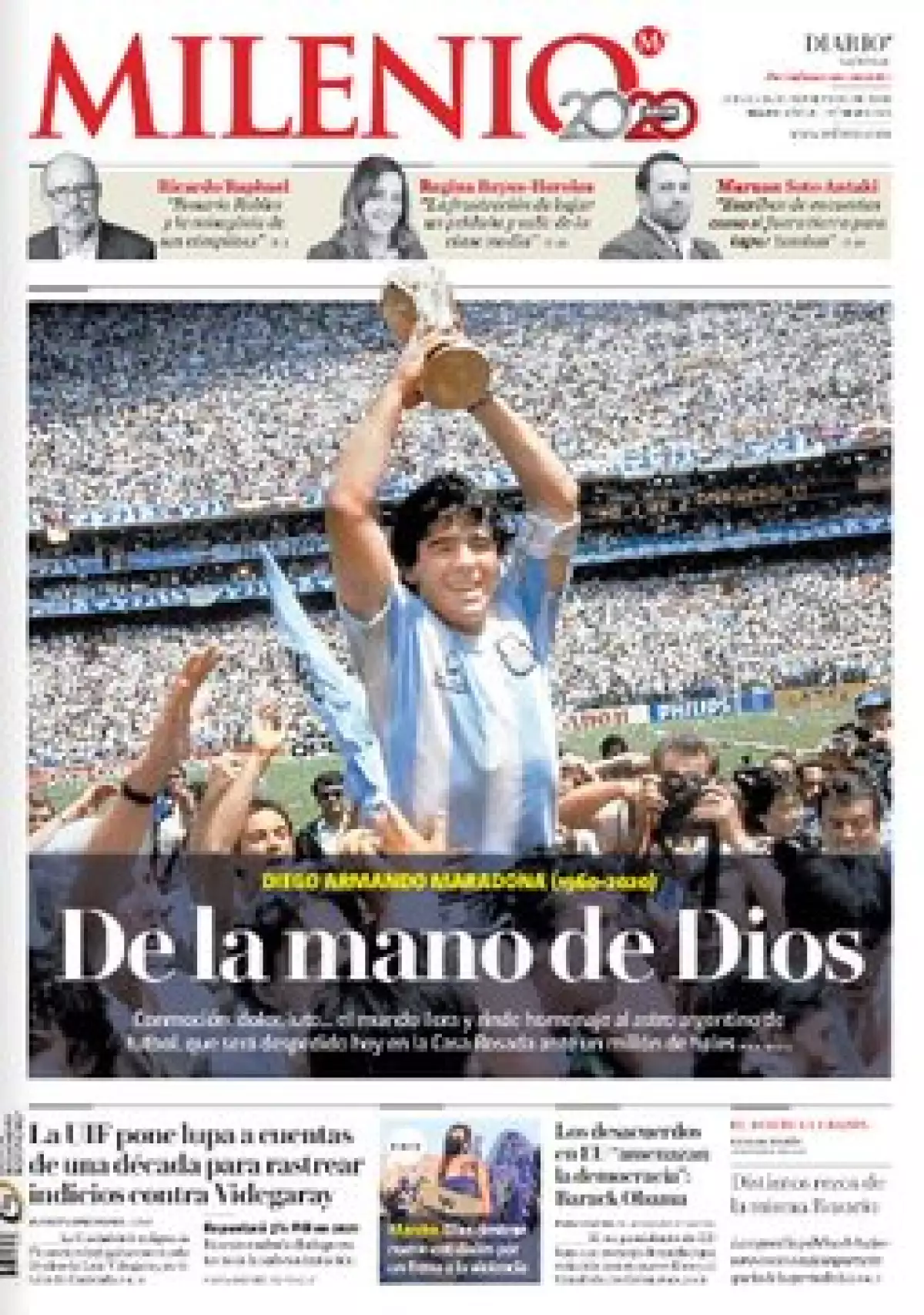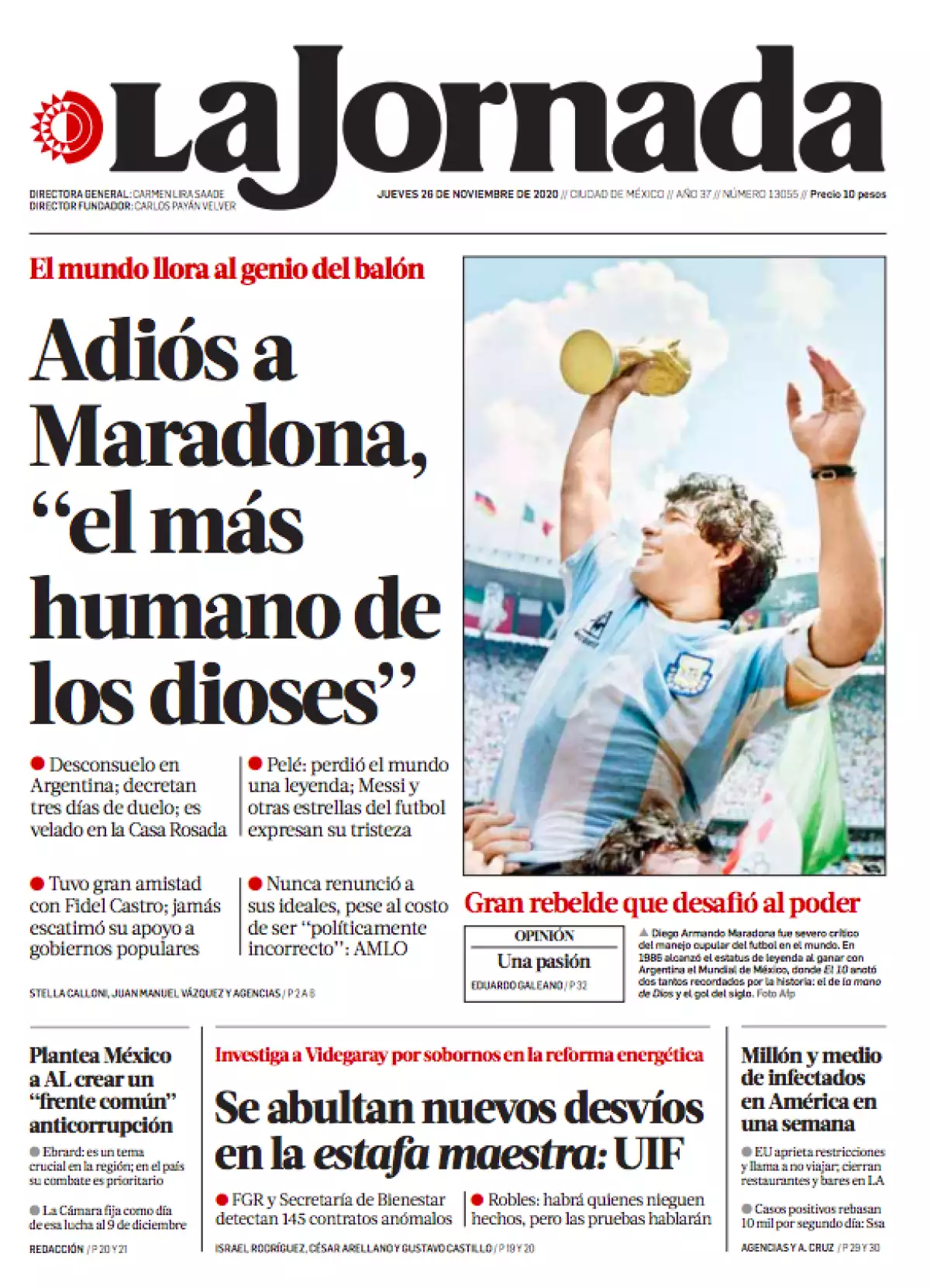 Diego Armando Maradona murió ayer a los 60 años por un infarto, destaca La Jornada . Diego, el hombre que vivió al límite su personaje, no resistió más. Maradona, el mito que construyeron entre todos en el mundo, permanece. Fue repentino, pero ¿acaso inesperado? El exjugador que convirtió una cifra en parte de su nombre, El Diez, falleció apenas unas semanas después de una cirugía para removerle un coágulo en la cabeza el 3 de noviembre y de haber cumplido años el 30 de octubre.