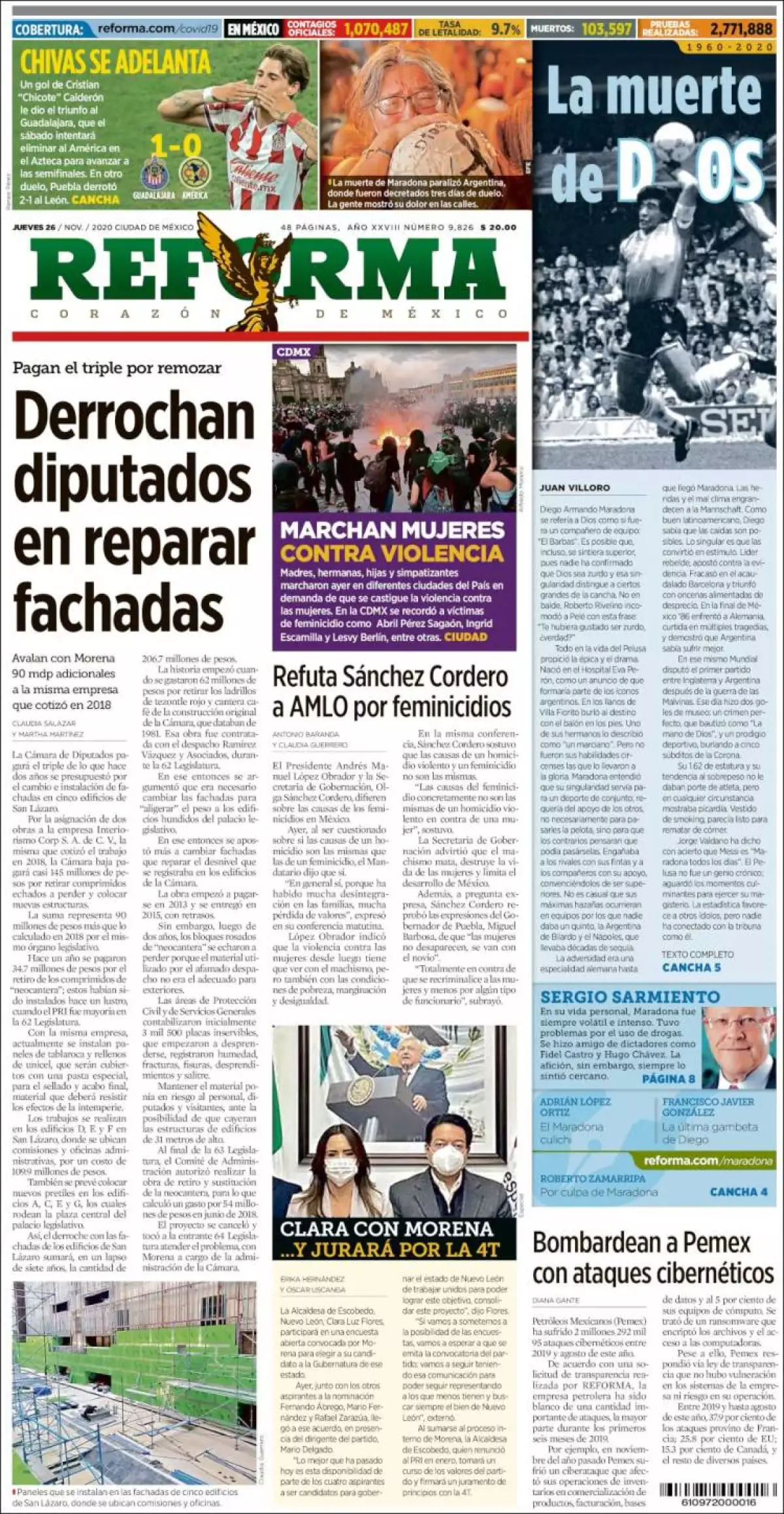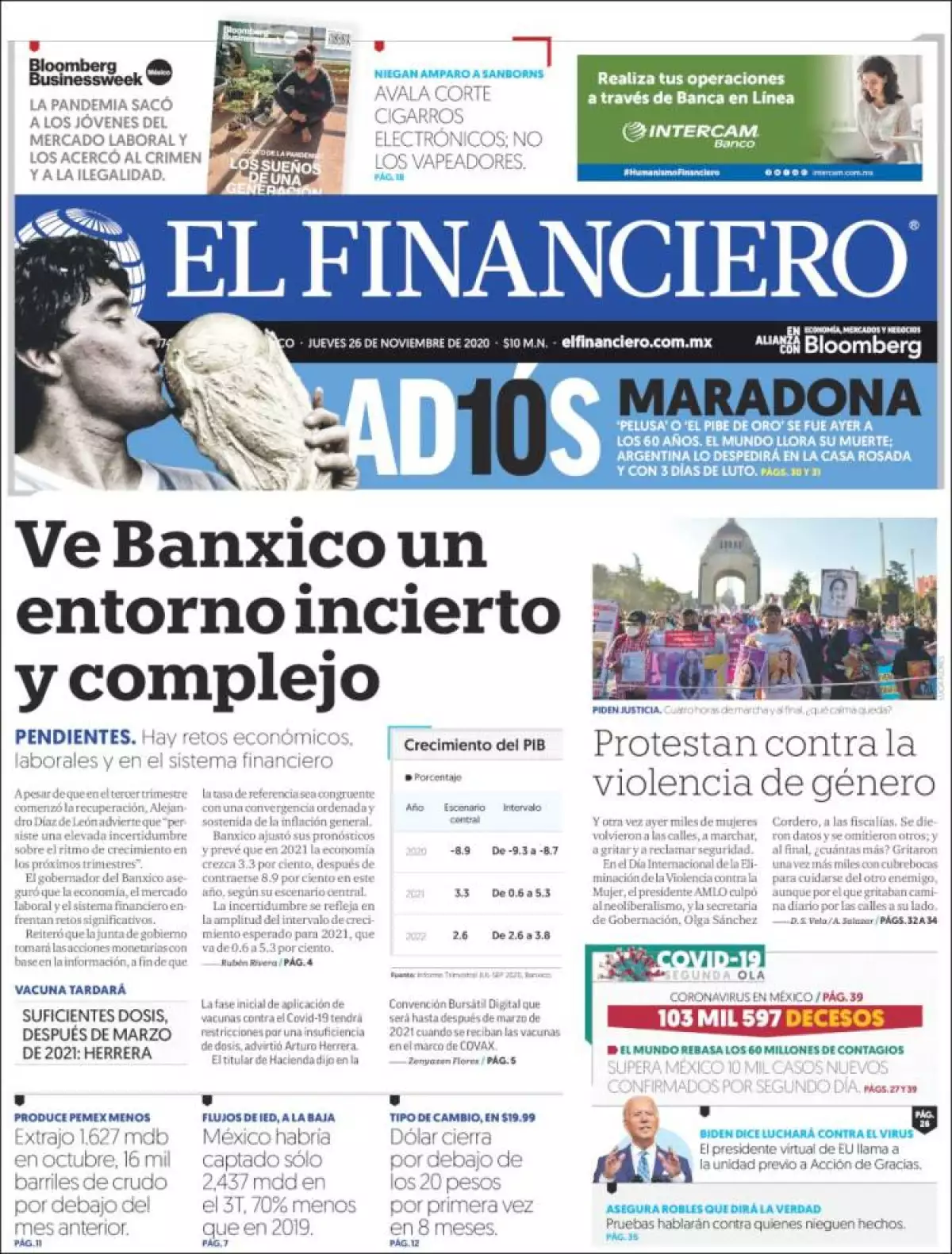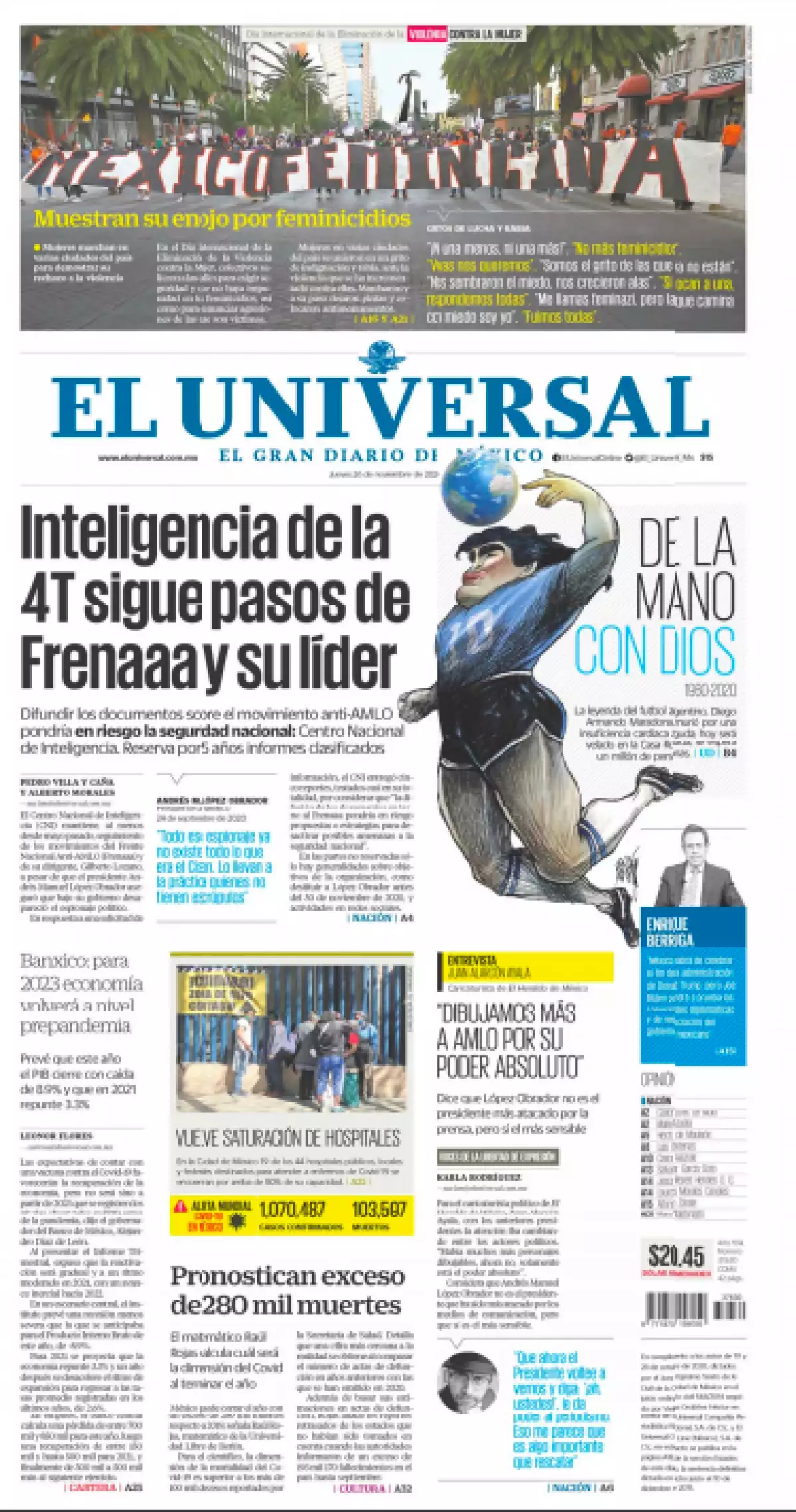 Diego Armando Maradona murió ayer a los 60 años por un infarto, destaca La Jornada . Diego, el hombre que vivió al límite su personaje, no resistió más. Maradona, el mito que construyeron entre todos en el mundo, permanece. Fue repentino, pero ¿acaso inesperado? El exjugador que convirtió una cifra en parte de su nombre, El Diez, falleció apenas unas semanas después de una cirugía para removerle un coágulo en la cabeza el 3 de noviembre y de haber cumplido años el 30 de octubre.