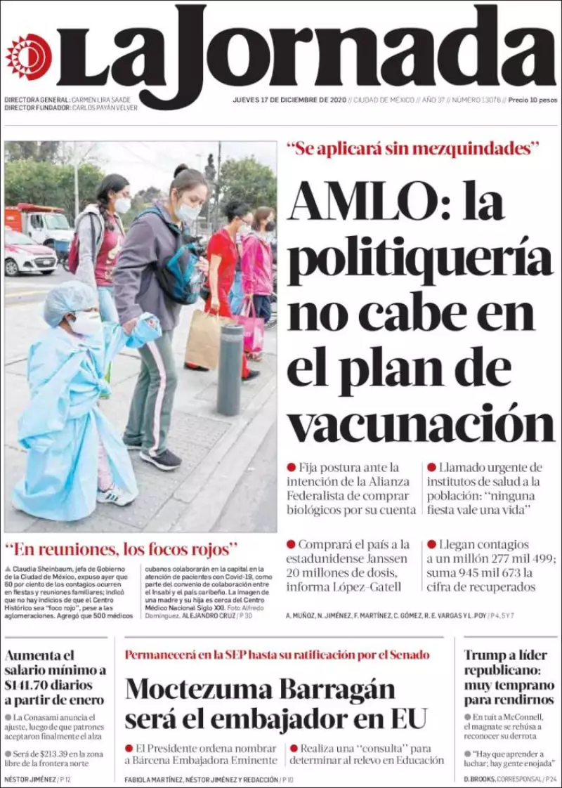 Ante el aumento de casos de COVID-19 reportados en días recientes, el presidente Andrés Manuel López Obrador advirtió que hay un incremento de hospitalizaciones y contagios en ocho entidades, entre ellas la Ciudad de México, y reiteró su llamado a reforzar los cuidados, reseña La Jornada . Más tarde, en gira por Sonora, ratificó que el plan de vacunación contra el coronavirus se aplicará “sin mezquindades” en todo el país y aseguró que un programa de vacunación no puede ser utilizado con propósitos electorales ni políticos.