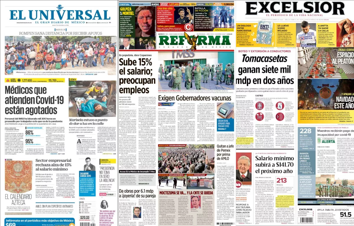 El salario mínimo general, el de la frontera norte y los profesionales, tendrán un incremento de 15% para 2021, pese al voto en contra del sector privado, destaca Reforma . El aumento se aprobó ayer en la Comisión Nacional de Salarios Mínimos (Conasami), sólo con los votos del Gobierno y el sector obrero.