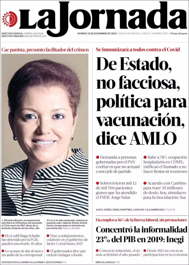 La aplicación de las vacunas contra el COVID-19 será con base en una política de Estado, sin actuar de forma facciosa ni como jefes de grupo o de partido, aseguró el presidente Andrés Manuel López Obrador. Ante el incremento de contagios, indica La Jornada , llamó a que las precampañas –a partir del 23 de diciembre– se realicen sin actos masivos, y pidió a las autoridades electorales establecer las reglas, porque sería irresponsable no guardar la sana distancia.