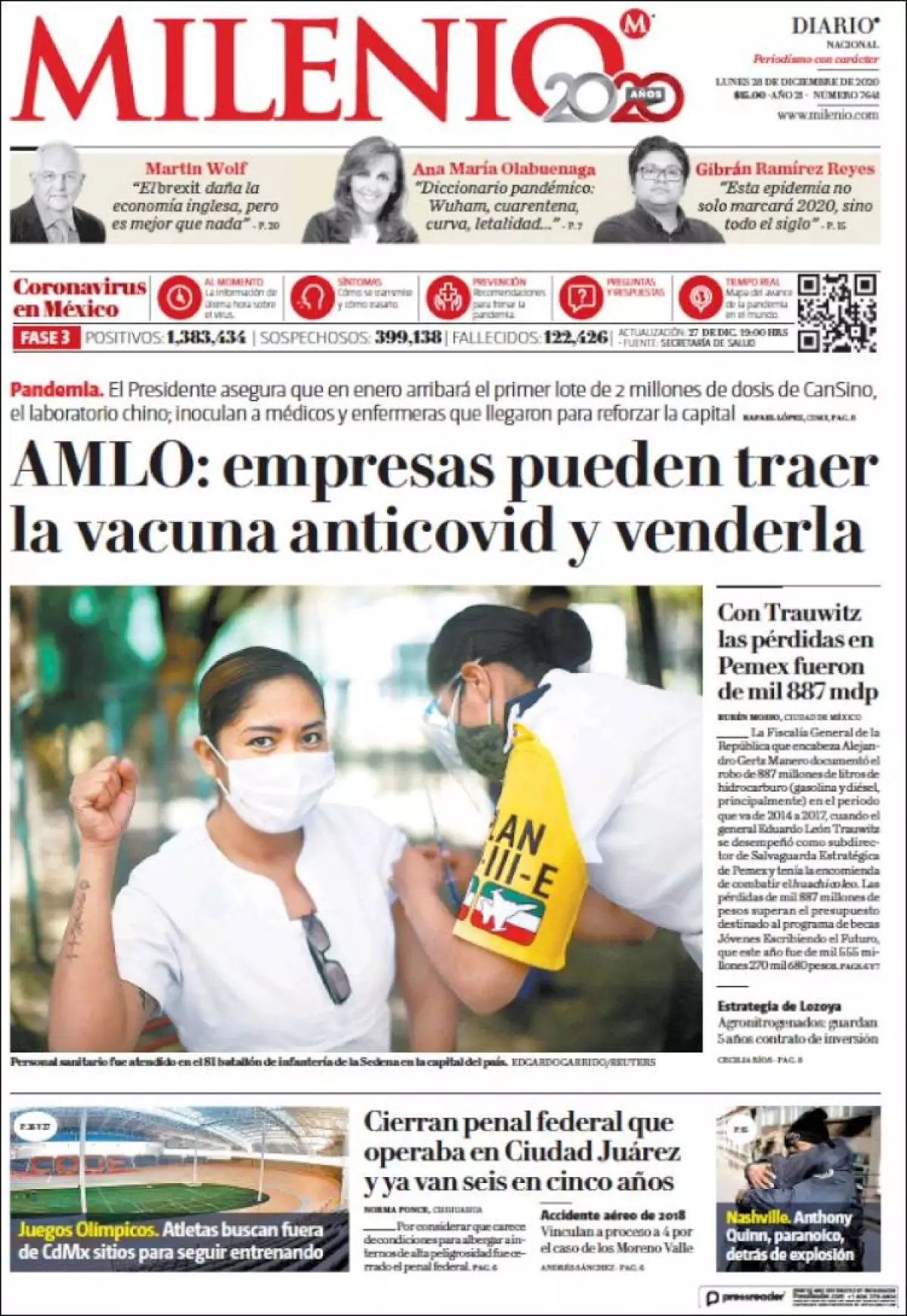 El presidente Andrés Manuel López Obrador afirmó que la iniciativa privada podrá comprar vacunas en el extranjero para que se pueda vender en México, publica Milenio en su portada. Mediante un mensaje en Twitter, López Obrador señaló que el gobierno federal compra las vacunas necesarias para garantizar el acceso universal y gratuito.