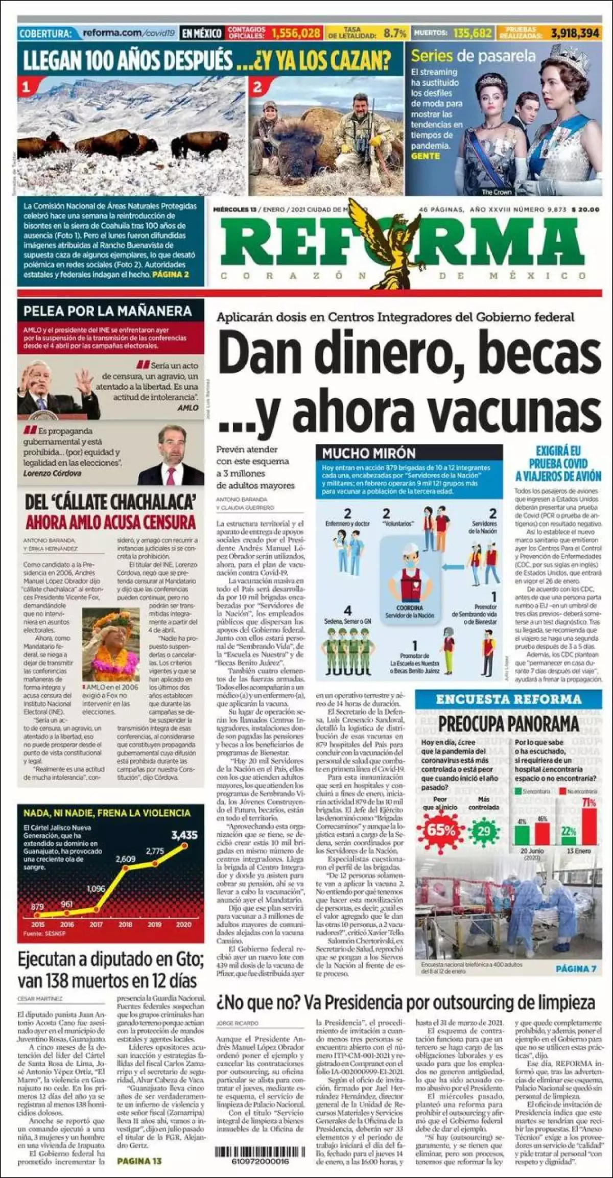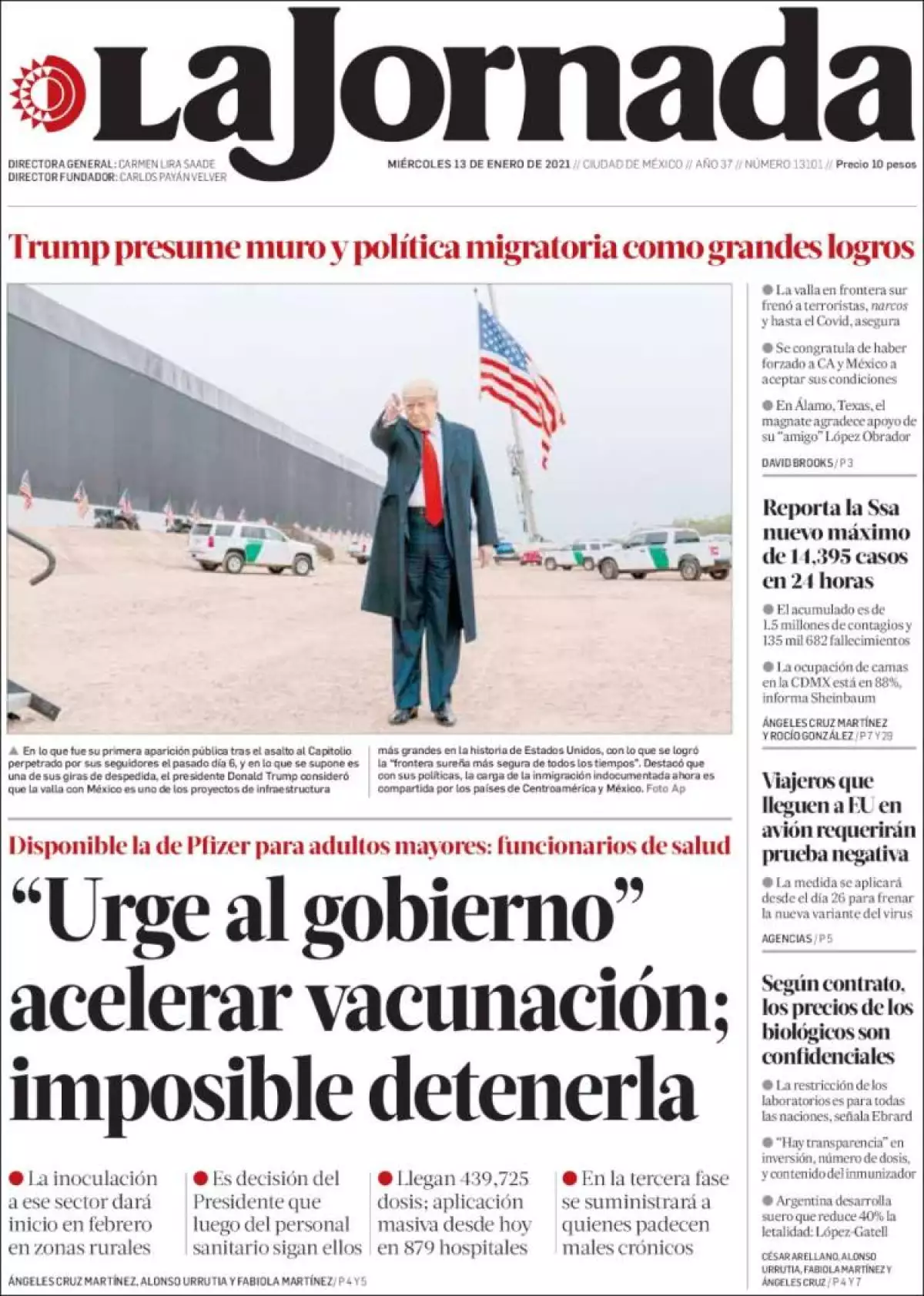 Al gobierno federal “le urge” acelerar la aplicación de la vacuna contra el COVID-19. Es un proceso que no se debe detener, por lo cual a los adultos mayores se les administrará el biológico de Pfizer, el cual está disponible y cada mes llegarán lotes más grandes, señala La Jornada . En febrero serán más de 1.8 millones de dosis que no se pueden guardar y tampoco es factible esperar a ver si llega la vacuna china o alguna otra que sea de una sola dosis para facilitar la estrategia de aplicación en las localidades más apartadas del país, afirmaron funcionarios del sector salud.