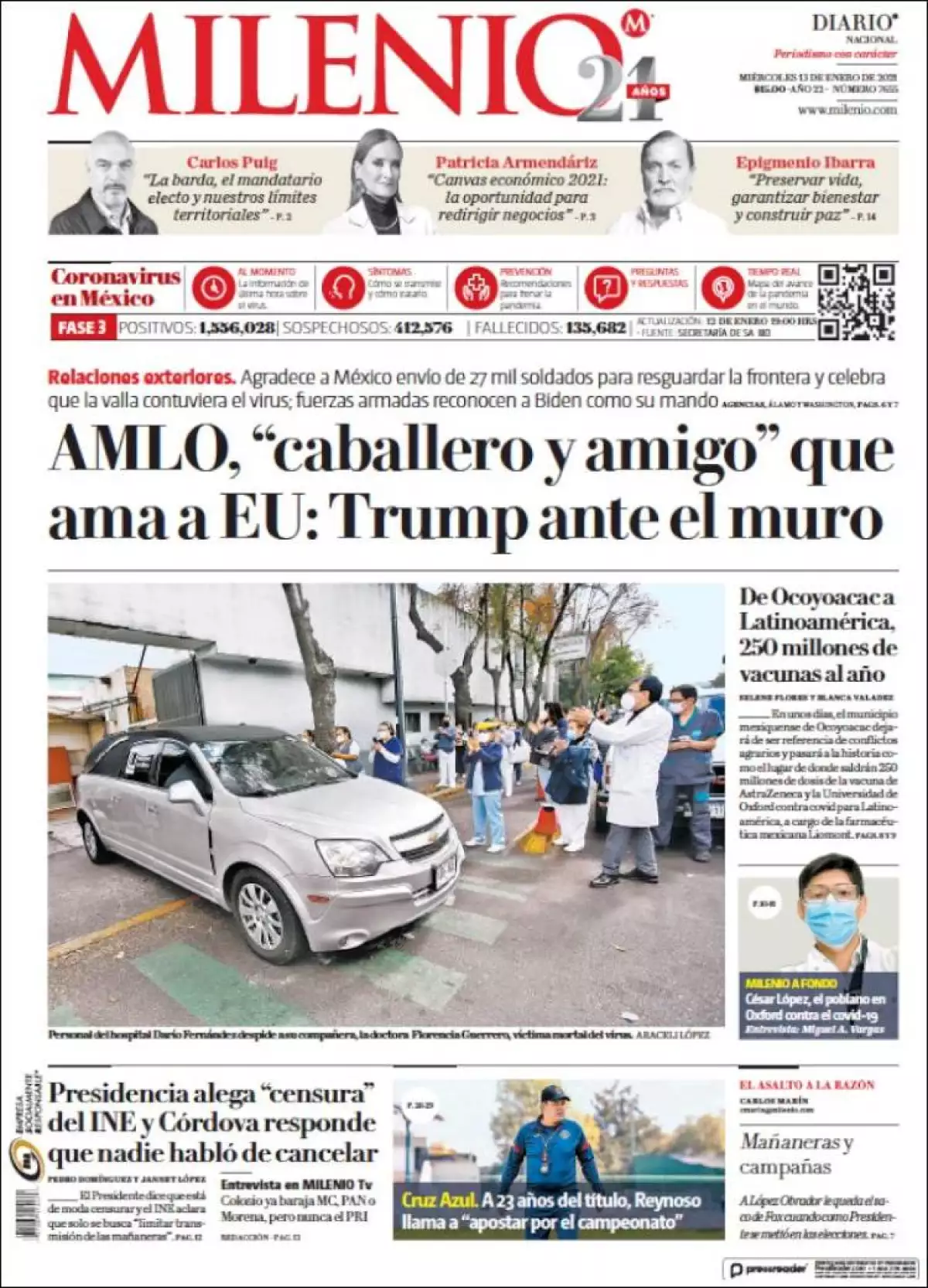 A tan solo ocho días de dejar el cargo, el presidente Donald Trump agradeció este martes a Andrés Manuel López Obrador por su “amistad” y apoyo en el control de la frontera entre ambos países, destaca Milenio . En Álamo, Texas, junto a un tramo del muro que impulsa para prevenir “el crimen y las drogas”, el mandatario republicano no escatimó elogios para López Obrador.
