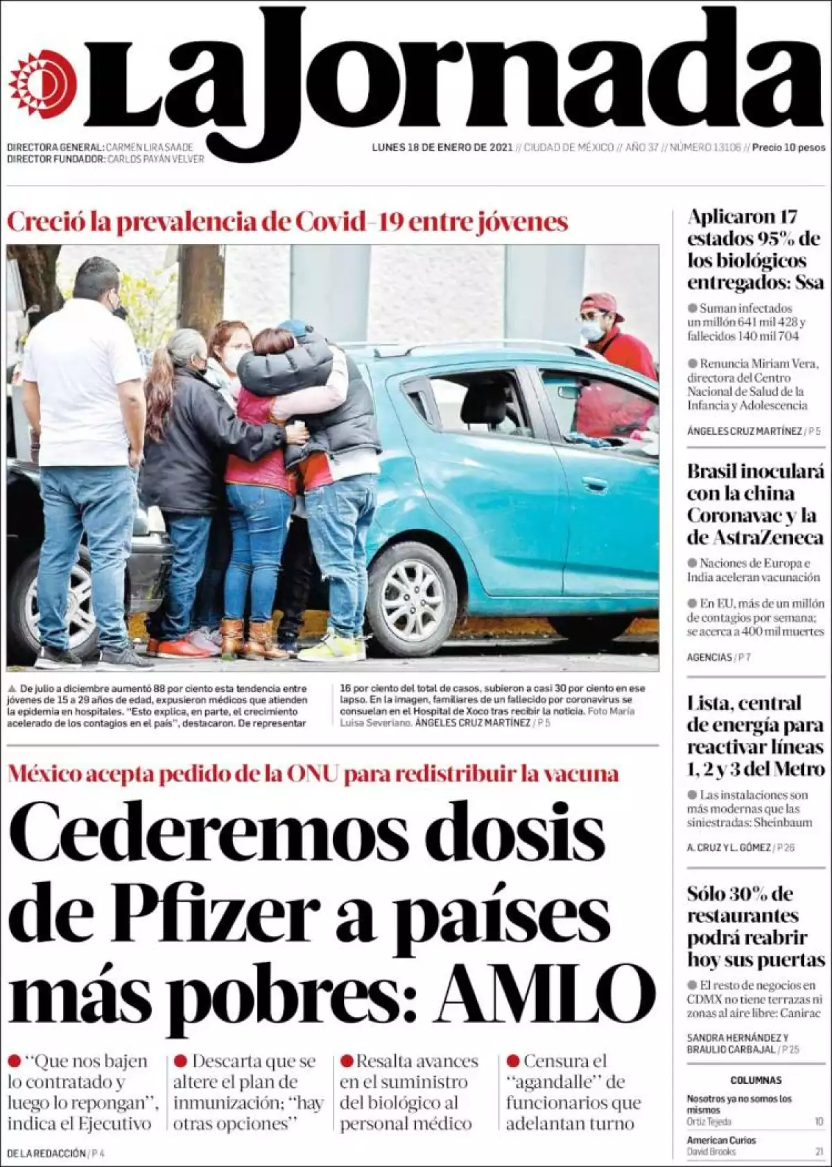 México aceptó la propuesta de la Organización de Naciones Unidas a fin de que los países que anticiparon acuerdos de compra de la vacuna contra el COVID-19 de Pfizer cedan parte de las dosis pactadas en los contratos a fin de que ese organismo la redistribuya en naciones más pobres, indica La Jornada. Así lo anunció el presidente Andrés Manuel López Obrador, ayer en Juan R. Escudero, Guerrero. “Nosotros estuvimos de acuerdo, que nos bajen y luego nos repongan lo que nos corresponde”.