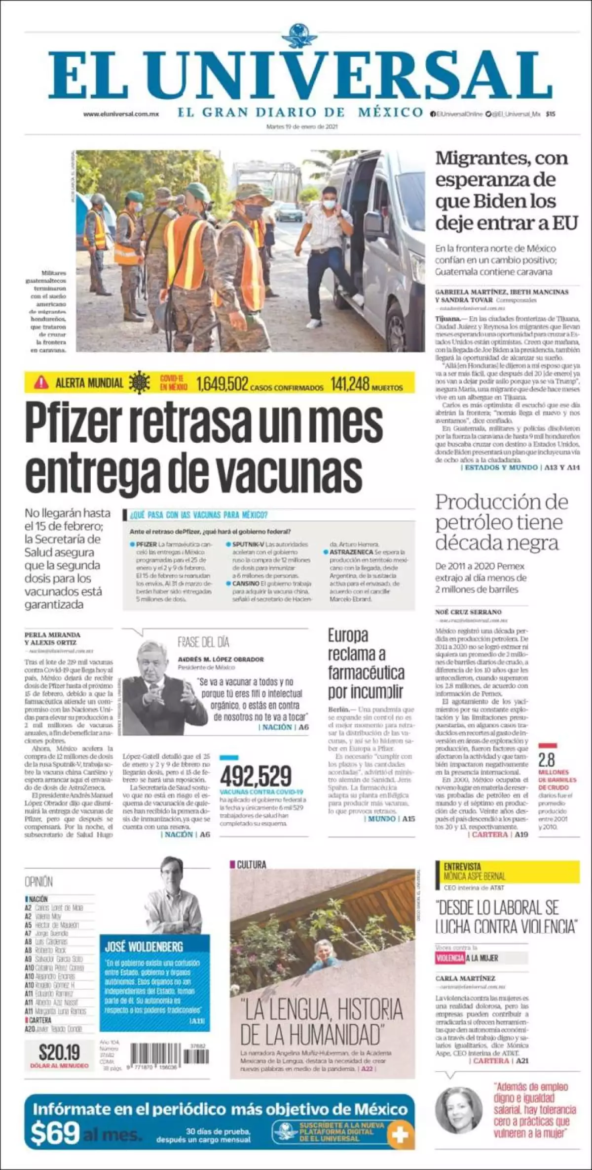Con solo 6,546 personas que ya recibieron la segunda dosis contra COVID-19 en todo el país –485,983 solo tienen la primera–, la estrategia de vacunación del gobierno mexicano se verá frenada, indica El Financiero . Al menos hasta el 15 de febrero, una vez que Pfizer y BioNTech reanuden las entregas, o que haya sido autorizada la aplicación y arribe al país algún fármaco de otro laboratorio.