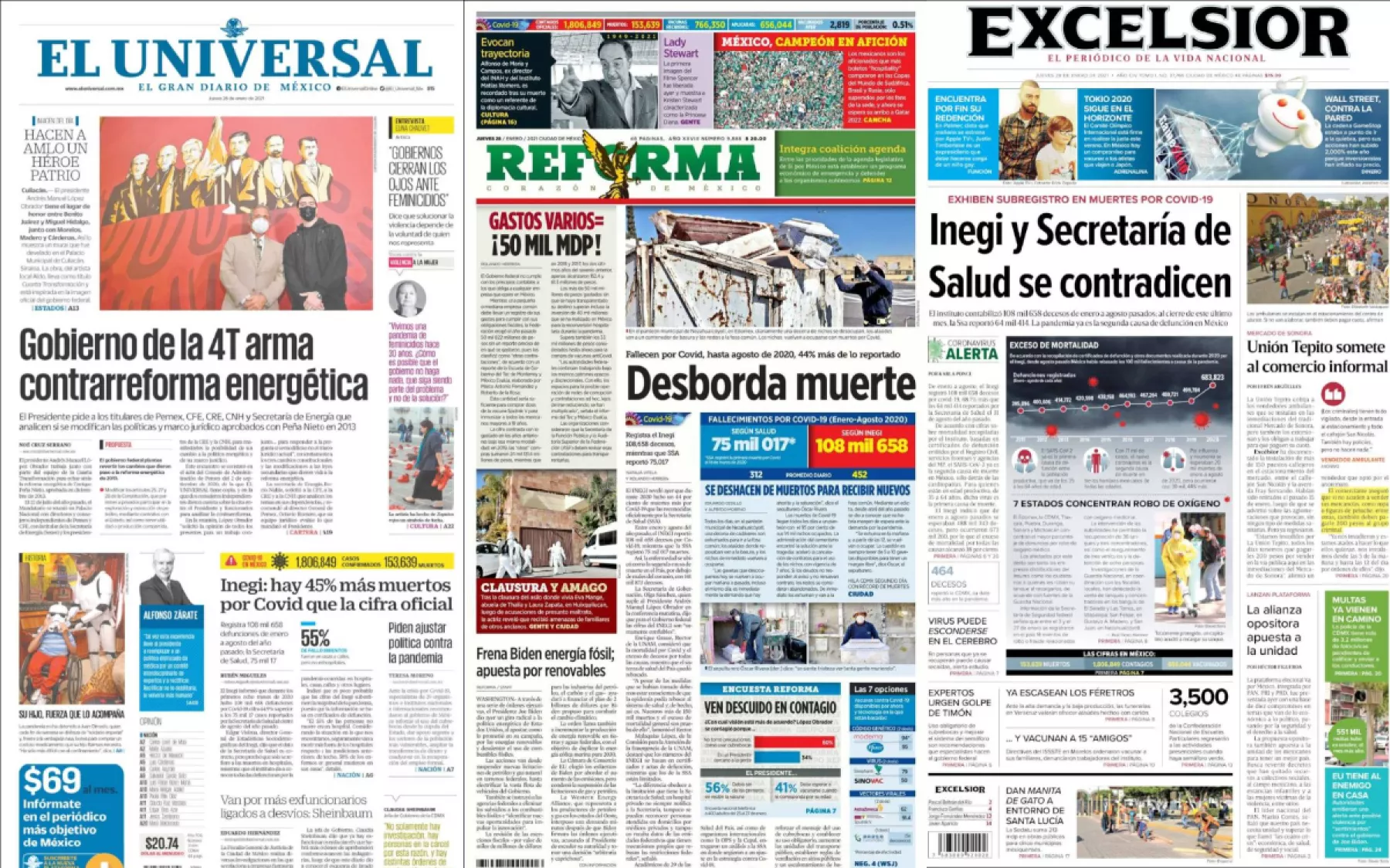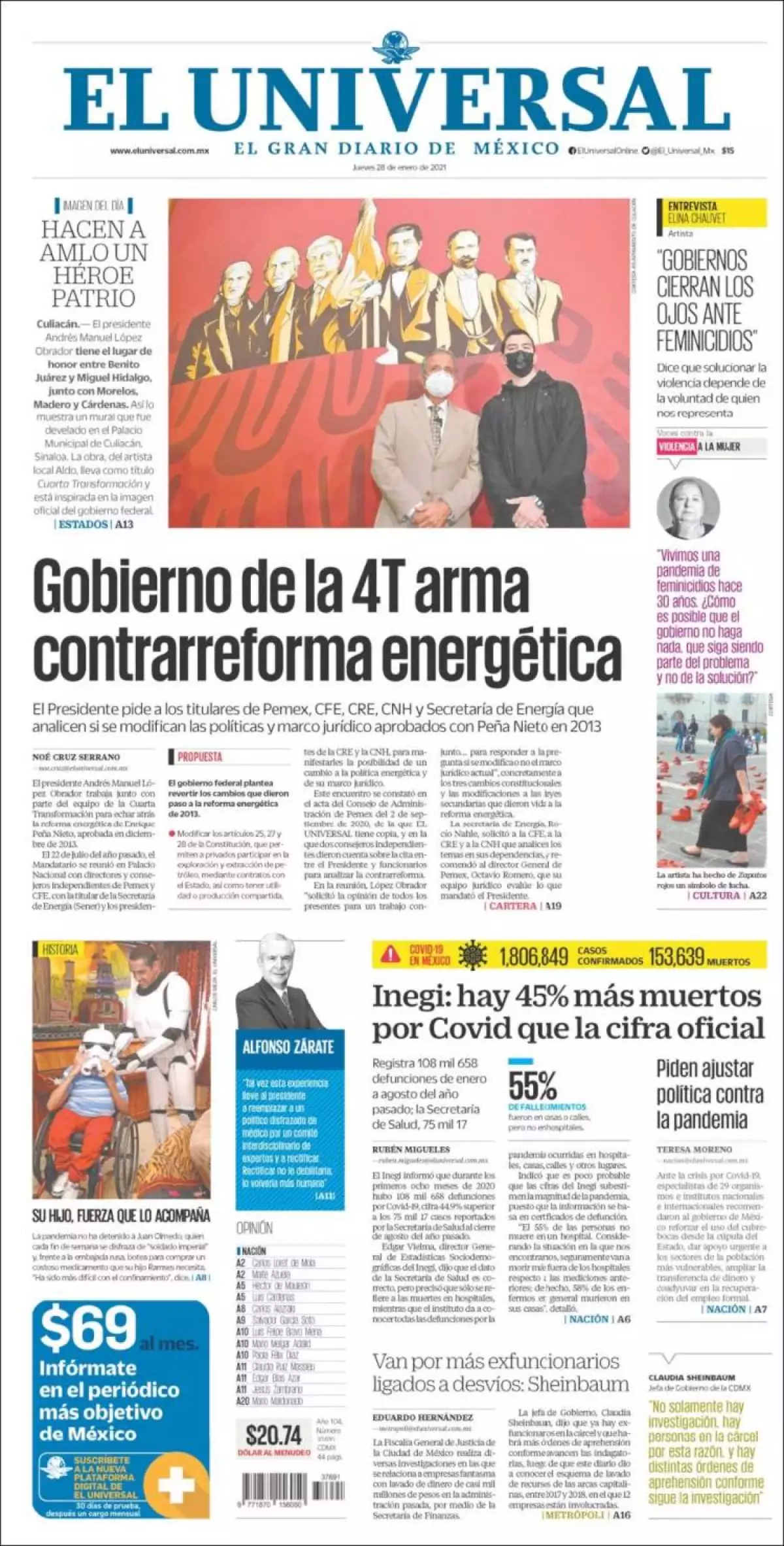 El presidente Andrés Manuel López Obrador trabaja en cambios constitucionales y leyes secundarias para revertir la reforma energética de 2013, consigna El Universal en uno de los temas de portada.