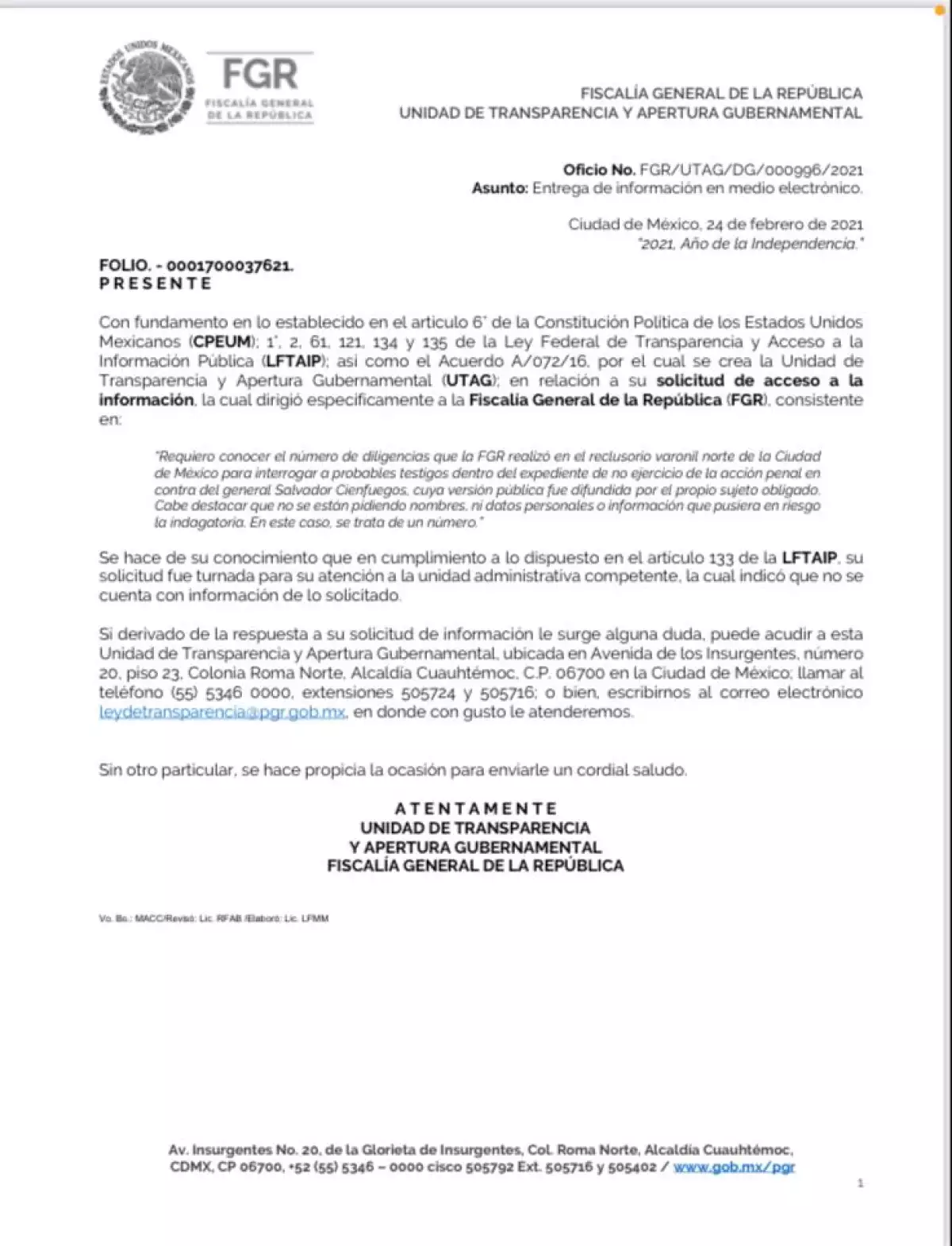 En la solicitud contestada el pasado 24 de febrero, la FGR aseguró que no existía información en sus archivos sobre alguna diligencia que hubiera realizado en el reclusorio de la Ciudad de México para interrogar a probables testigos dentro del expediente de no ejercicio de la acción penal en contra del general Cienfuegos.