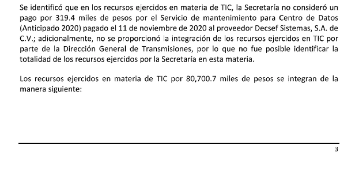 Después del pliego de observaciones, se lee que la causa raíz probable de la irregularidad en los contratos de TIC es “falta supervisión y control en el seguimiento de entrega de servicios por parte del proveedor”, es decir, la Sedena contrató, pagó, pero no verificó que los servicios se cumplieran.