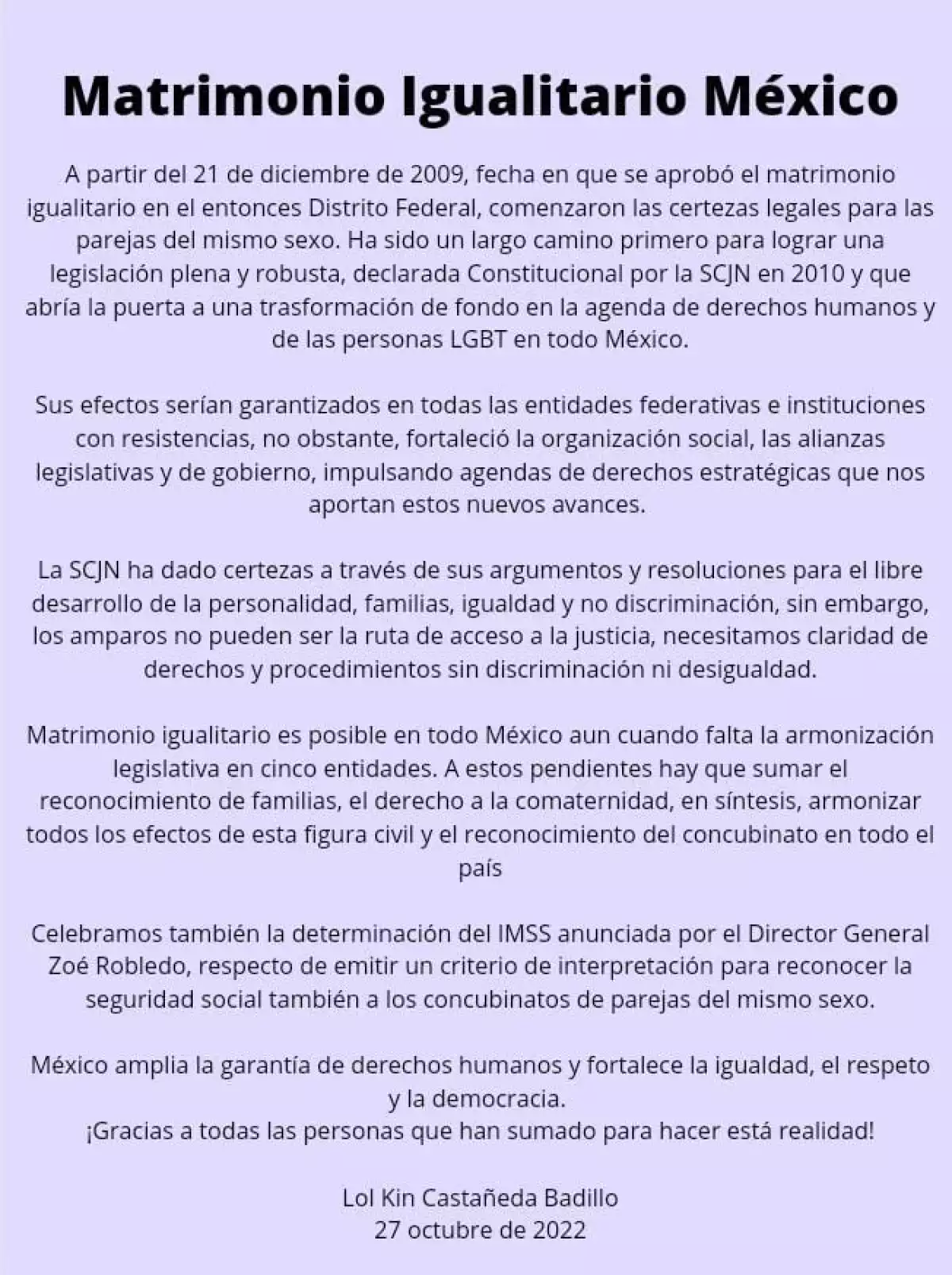 “La resolución emitida por la Suprema Corte de Justicia de la Nación al resolver la Acción de Inconstitucionalidad 2/2010 promovida por la entonces Procuraduría General de la República y en el marco de la reforma constitucional en materia de derechos humanos de 2011, derivó en la emisión de un criterio de interpretación para permitir el acceso al referido seguro al cónyuge del asegurado (a) o pensionado (a), con independencia de si se trata de matrimonio entre personas del mismo o distinto sexo, criterio que no se hizo extensivo a otras figuras como el concubinato”, detalló el IMSS.