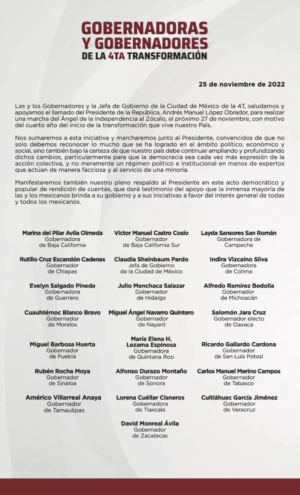 "Nos sumaremos a esta iniciativa y marcharemos junto al Presidente, convencidos de que no solo debemos reconocer lo mucho que se ha logrado en el ambito politico, economico y social, sino también bajo la certeza de que nuestro país debe continuar ampliando y profundizando dichos cambios, particularmente para que la democracia sea cada vez más expresión de la acción colectiva, y no meramente un régimen político e institucional en manos de expertos que actúan de manera facciosa o al servicio de una minoría" , se lee en el desplegado por los gobernadores morenistas.
