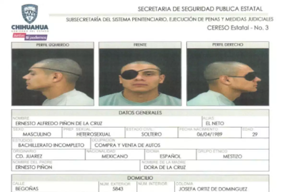 "El Neto" fue detenido en 2009 y desde esa fecha se encontraba recluido en el Centro Estatal de Reinserción Social número 3 (Cereso), de Ciudad Juárez. Está acusado de secuestro y homicidio, delitos por los cuales obtuvo una sentencia de 224 años de prisión.