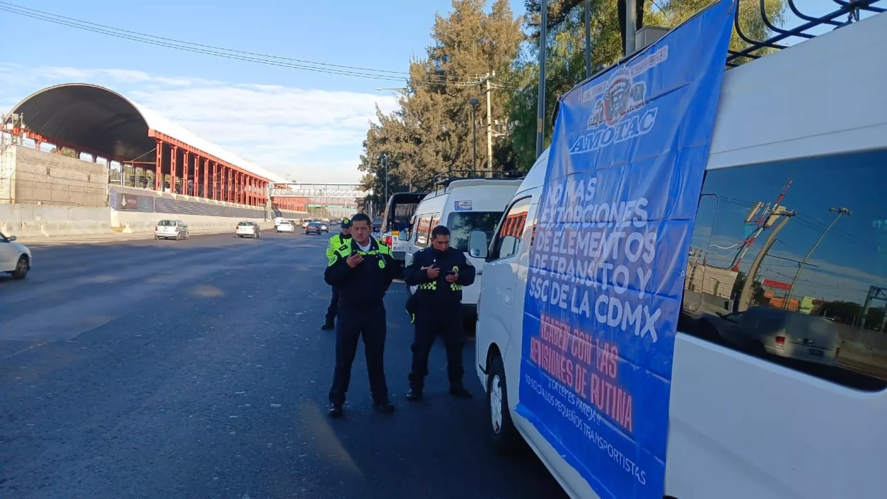 Los transportistas con mantas y emblemas de la AMOTAC ya hacen fila sobre la Calzada Zaragoza, a la altura del Metro Acatitla y con dirección al viaducto.