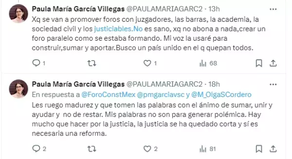 Cuestionada por un usuario sobre las razones por las que eliminó su mensaje de redes sociales, la magistrada apuntó que lo borró porque se van a promover foros con juzgadores, las barras de abogados, la academia y sociedad civil y no abona a nada crear un foro paralelo.