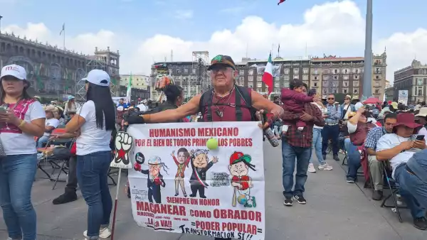 En contrate con el sentir de los familiares de desaparecidos, el Zócalo se llenó este domingo con música de batucada, vendedores de peluches, playeras, bolsas y llaveros con la imagen de López Obrador.