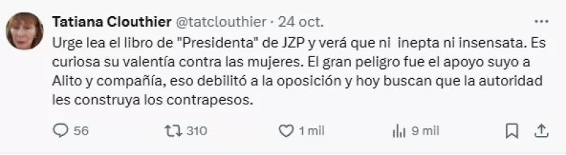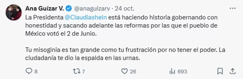 "Presidenta, ¿en verdad cree que un 'junior' tendría el valor de enfrentar abiertamente a los últimos tres mandatarios (EPN, AMLO y usted) por su autoritarismo, su corrupción, sus abusos y su ineptitud? No señora, los 'juniors' andan escondidos en sus privilegios o tras la sombra de su padre (¿le suena?) o madre. Yo he dado la cara, y la seguiré dando, por aquello en lo que creo (y que usted lastima): la libertad, la democracia y la justicia.