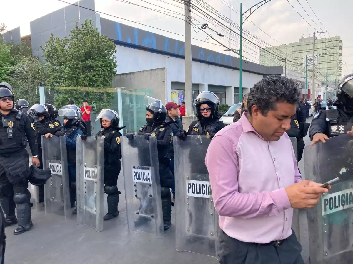 Alrededor de las 15:00 horas, elementos antimotines de la CDMX llegaron al sitio y formaron vallas en torno a la protesta.